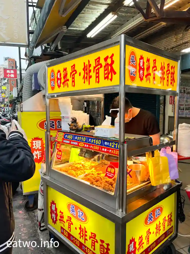 於737巷弄近末端有一間「吳記現炸無骨排骨酥」,有4個size可以選擇,價格介乎TWD60至210,主打無骨排骨酥。小攤車內有2款可以選擇,一款係肉條狀,另一款就係排骨狀,入口都係啖啖肉,無骨落地。排骨酥入口外脆內嫩,炸得酥香,而肉質亦保持鮮美,啖啖有咬口。