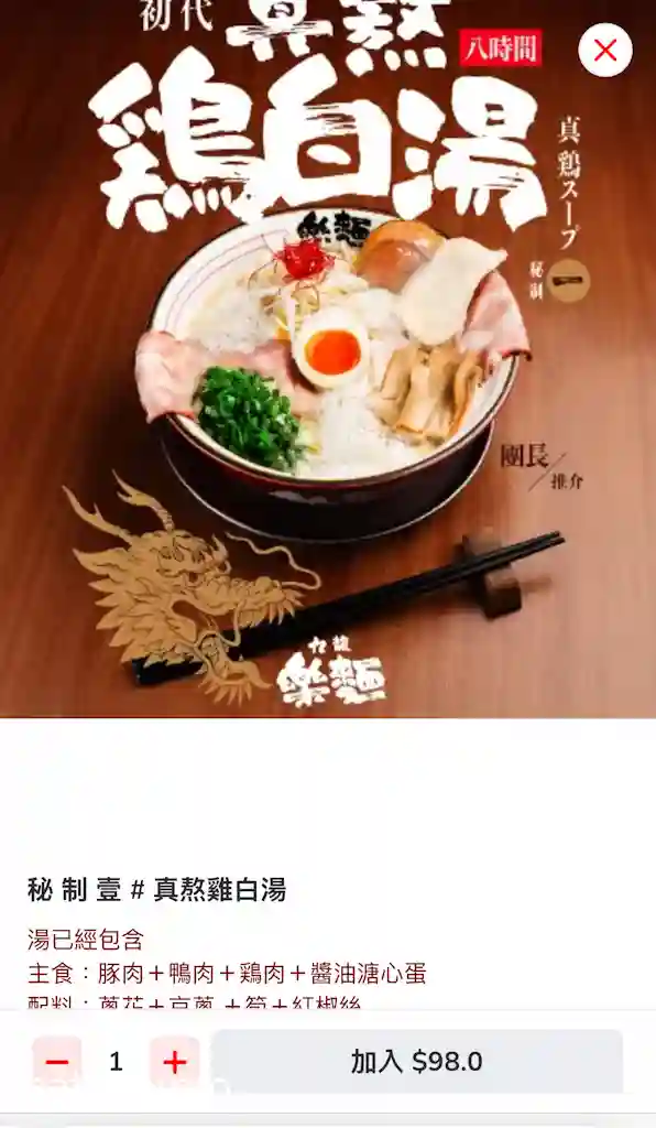 至於拉麵嘅豚肉、雞肉,則有啲遜色,據悉係慢煮,但質感都係比較嚡口同乾身,纖維好多,唔夠軟腍。畢竟係一碗百幾蚊嘅拉麵,價格上比一般拉麵店高,自然會有更高要求,只係該店賣點好似唔係日式拉麵,反而係港式拉麵風格,又似乎唔應該用日式拉麵標準看待,認真矛盾。