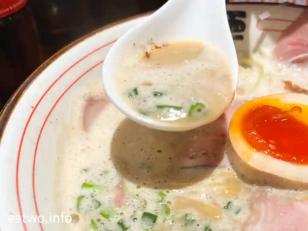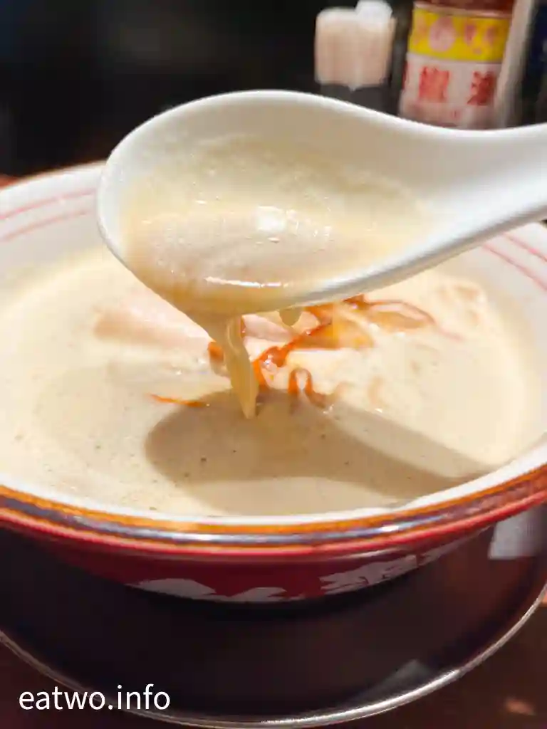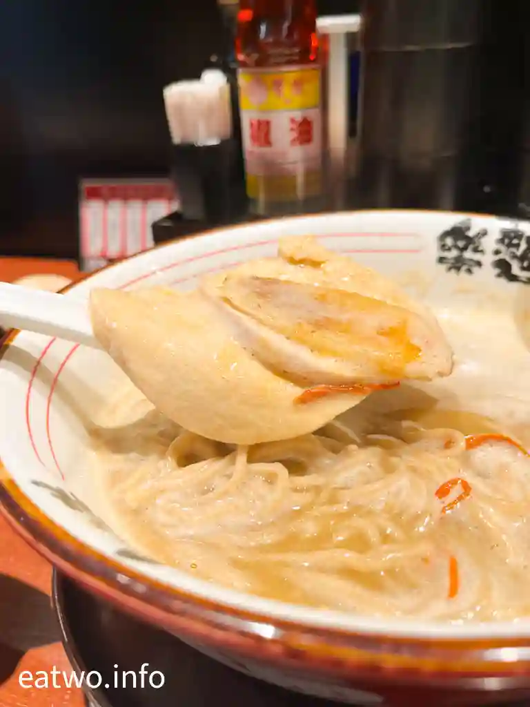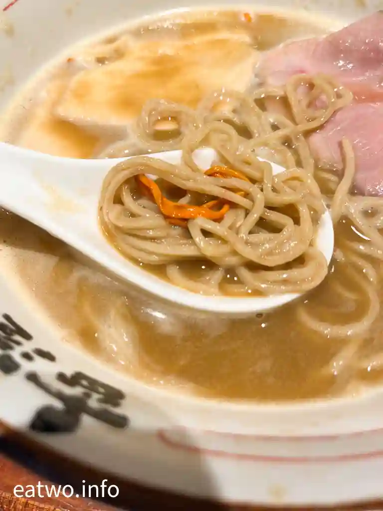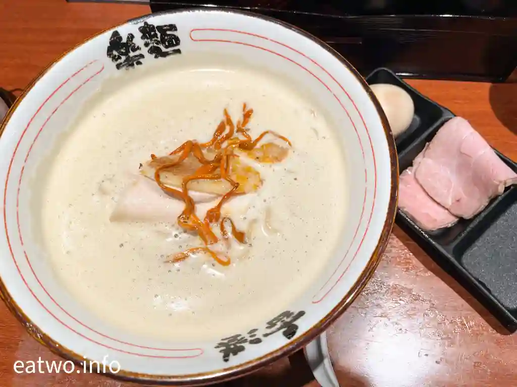 鰹魚雞白湯$108,有豚肉、木魚花、醬油溏心蛋、蔥花、京蔥、木魚花、筍、紅椒絲,不過只係上面加咗鰹魚。每款拉麵都可以揀日式拉麵、爽滑米粉、特製藜麥拉麵或真芫荽拉麵$8,最特別之處係該店特別聯乘「永樂粉麵廠」嘅伊麵,果然本土味十足!湯底可以揀淡口或加$10要濃口﹐呢碗鰹魚雞白湯拉麵雖然揀選濃口,但湯底味道比較淡,只係有打成奶泡狀態,質感較一般湯底滑溜。