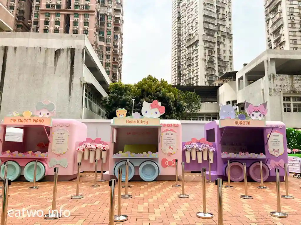 然後向「青洲坊蓮花廣場」方向走,即達其中一個大型Sanrio Characters打卡裝置。今次活動展覽大致上分成兩邊,呢邊以Hello Kitty、My Melody、Kuromi為主,只有呢3個角色嘅打卡裝置。當中3位角色嘅巨型雕塑像都係企定定喺度畀大家合照打卡!不過,呢3個角色基本上都只係得一個大型雕塑像,無乜特別,感覺同澳門當地係毫無關係。比如Hello Kitty隔離只係一架鋪滿花卉嘅木頭車,My Melody背後就係粉紅巚樹,而Kuromi後面就係一個有唔少花朵嘅噴泉,似乎只係同花有關係。由於時間太早,所以連攤位遊戲都未開放公眾參與。