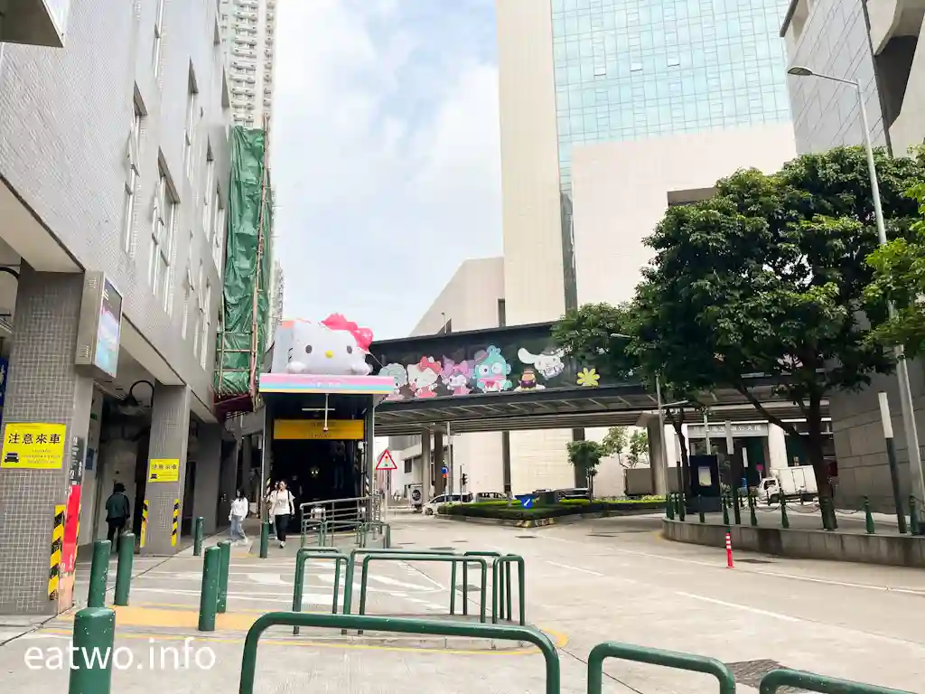 接下來可以向青茂口岸澳門邊檢大樓方向走,轉個彎就會見到另一個打卡位。位置係李寶椿街盡頭,抬頭就會見到一個Hello Kitty大頭,公仔喺出入口扶手電梯上面,而條橋玻璃就貼有Sanrio角色,其實呢個位都真係無乜特別可取之處,行過剛才Hello Kitty、My Melody、Kuromi打卡裝置,咪轉個彎睇埋囉。