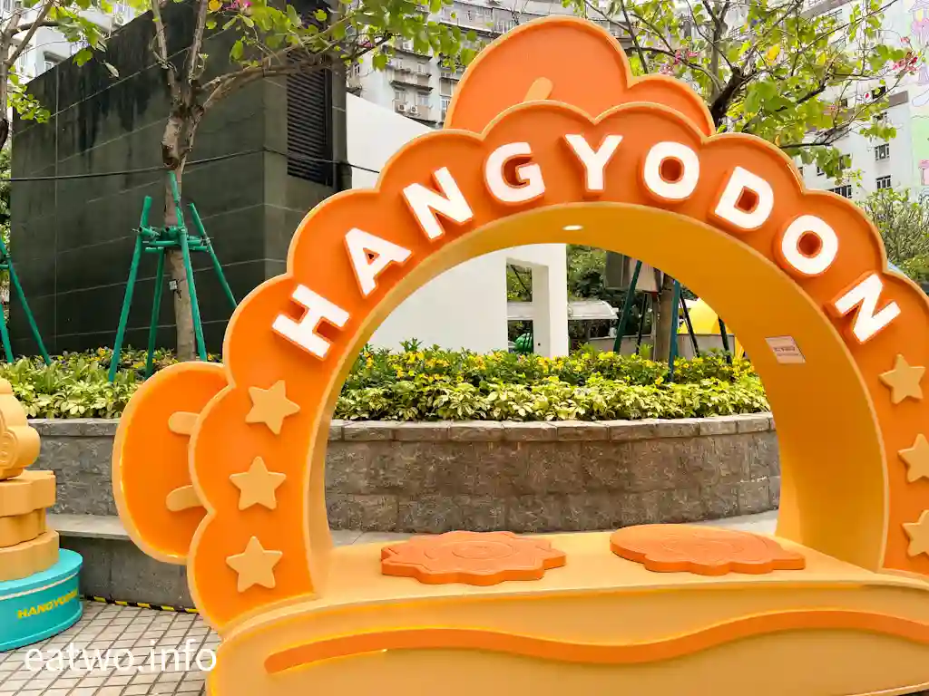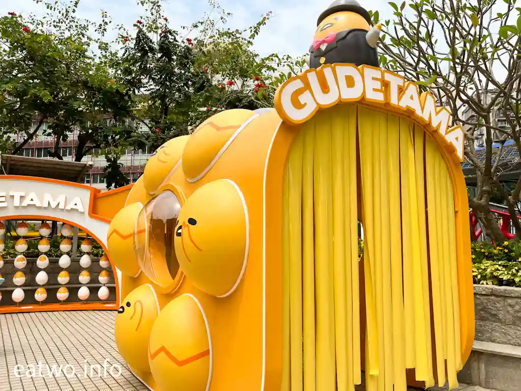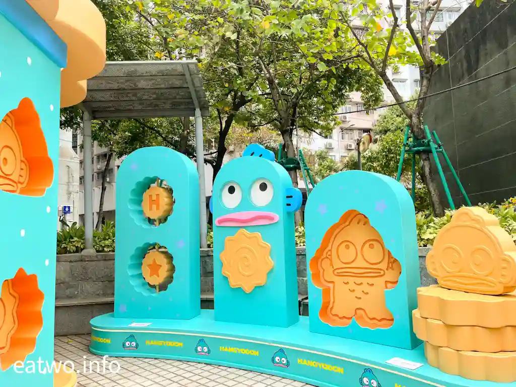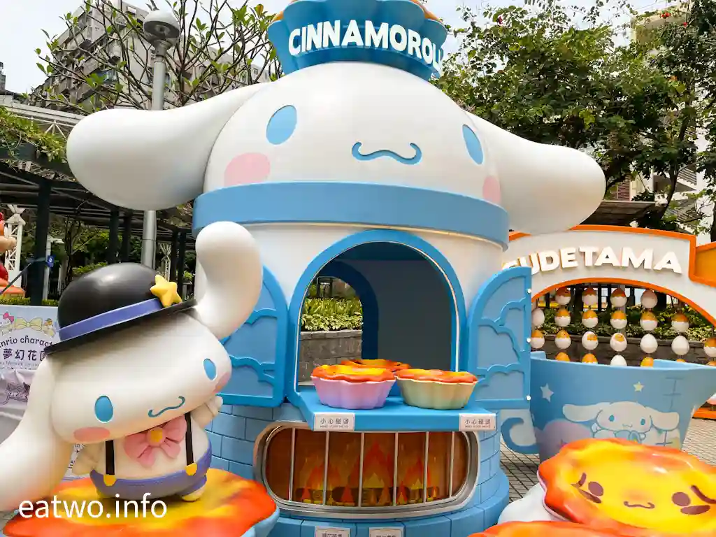 最後,只要繼續前往「祐漢街市公園」,就會搵到另外幾個Sanrio Characters嘅打卡裝置,位置就係「祐漢街市」旁邊。呢邊就係玉桂狗、水怪、蛋黃哥,同樣因為時間太早,攤位遊戲未到下晝都唔會開放,所以基本上只可以影吓角色雕塑像。從展覽可見,主辦單位係比較重視玉桂狗、水怪、蛋黃哥,因為呢3個明顯地同澳門主題有關係,而且雕塑像有嘢互動吓,唔係單單得一個雕塑像企喺度畀人打卡。比如玉桂狗就係同澳門葡撻有關係,變成一個焗葡撻嘅地方,個人可以企入去打卡;而蛋黃哥就有一條隧道,而隧道另一邊就有一幕雞蛋牆,同澳門雞蛋仔有啲關係;至於水怪,就有各式杏仁餅之類手信,都係同澳門當地受歡迎嘅特色美食有一定關係。