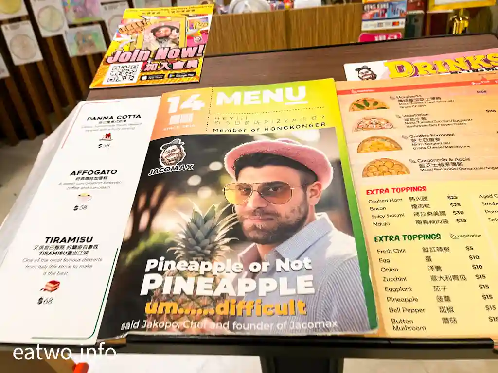 意大利人一向好抗拒食菠蘿Pizza,但香港有個意大利人開設Pizza店時,竟然以菠蘿Pizza為賣點,目前該店全港僅餘4間分店,不妨拍拖兩個人去試伏。今次E.A.Two前往將軍澳分店,發現餐牌內嘅選擇同其他分店無異,但就有少少唔同,原來有部份係將軍澳分店限定選擇!