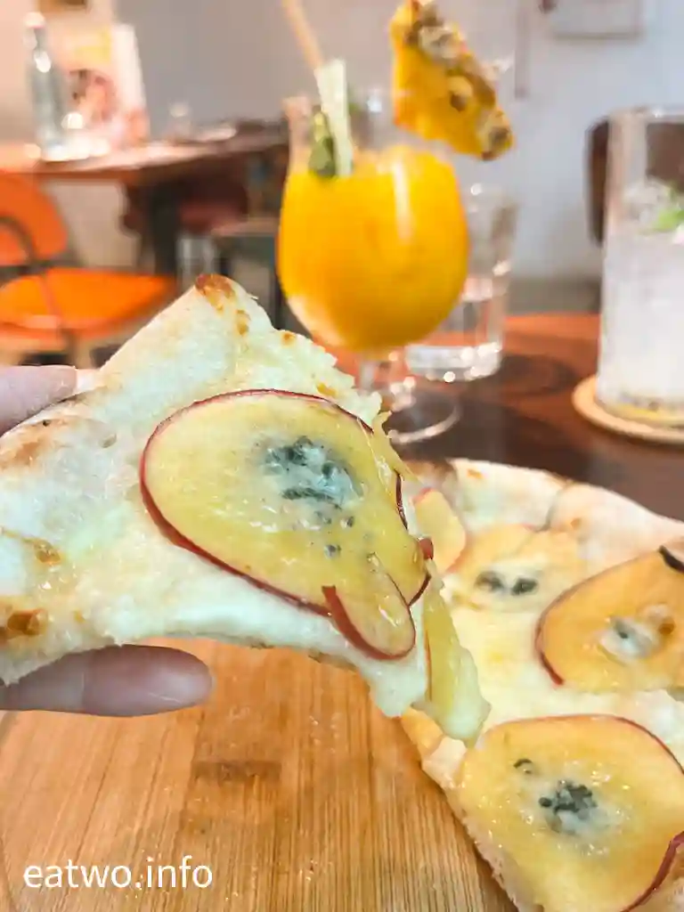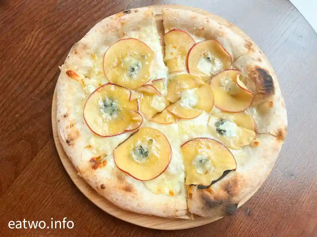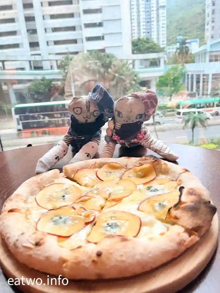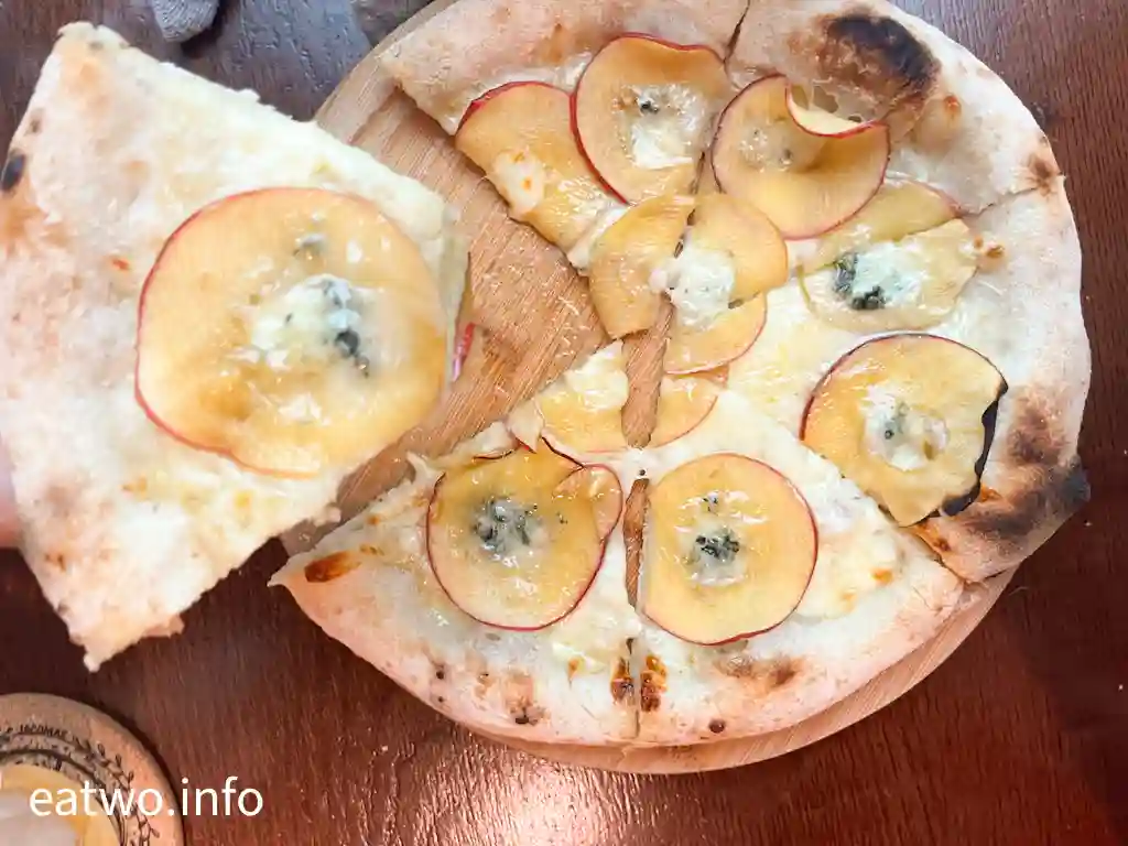 Pizza有9吋、12吋可擇,雖則寫明1人、2至3人享用,但其實兩個人叫9吋都已經足夠,據悉Pizza有獨特秘方炮製。Pizza選擇不少,今次揀咗比較特別嘅藍芝士蘋果薄餅$133,9吋切開就有6塊,兩個人平均每人可以食3塊Pizza。後來發現,原來呢款藍芝士蘋果薄餅係該店嘅鎮店之作!