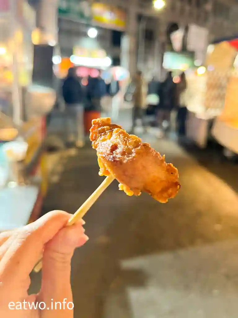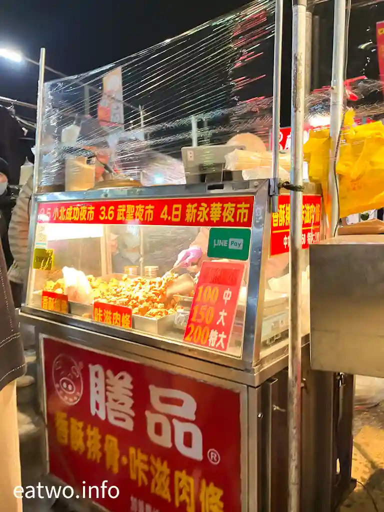 夜市內有間「膳品香酥排骨」,一份咔滋肉條TWD100至200,聞落頗香口,幾有酥香感,不時有在地人到小攤購買。呢間小吃於「新永華夜市」、「小北成功夜市」都有得食。