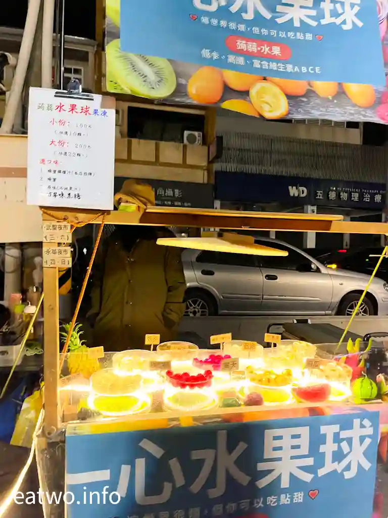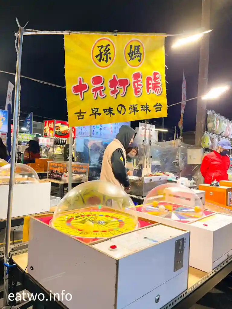 「武聖夜市」琳瑯滿目,內裏唔單止有小吃、彈珠台、射飛鏢、套圈圈等基本夜市攤檔,當中「孫媽十元打香腸」配搭古早味彈珠台,玩完彈珠嬴咗就有條香腸。其餘小吃有吃法新穎嘅「海苔甜玉米」,顏色鮮艷奪目嘅「一心水果球」TWD150至200,又或者「董家麻糬冰燒麻糬」,一份麻糬TWD55。