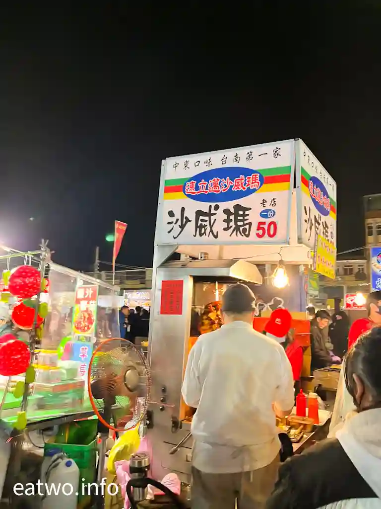 另外,夜市有間「中藥口味沙威碼」,鄰近停車場,由未開店到開店之後都有在地人大排長龍,每份只係TWD50,好似肉片嚟,然後擺入烤過嘅麵包內,再加入生菜、沙律醬等,係中東土耳其口味嘅小吃。同「阿佳佳純手工蔥油餅」TWD50一份嘅價錢差唔多,都係人氣小吃。