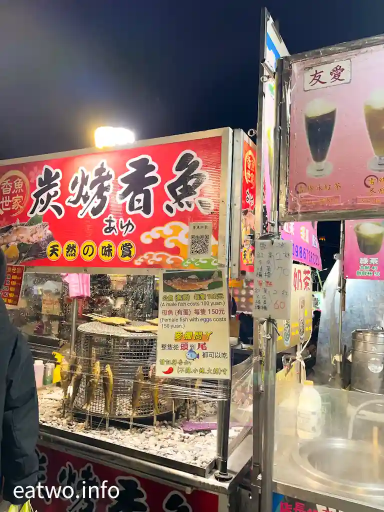 燒烤往往係夜市必食之選擇,當中都有好多間以燒烤為主打,比如「醬燒雞排炭烤」,一份TWD90,有日式醬燒、蜂蜜芥末、泰式酸辣﹐「花園夜市」、「大東東夜市」都有得食。又例如「炭烤香魚」,寫明香魚世家,一份TWD100至150,每條都係原條烤,分埋公魚同母魚,母魚貴啲。