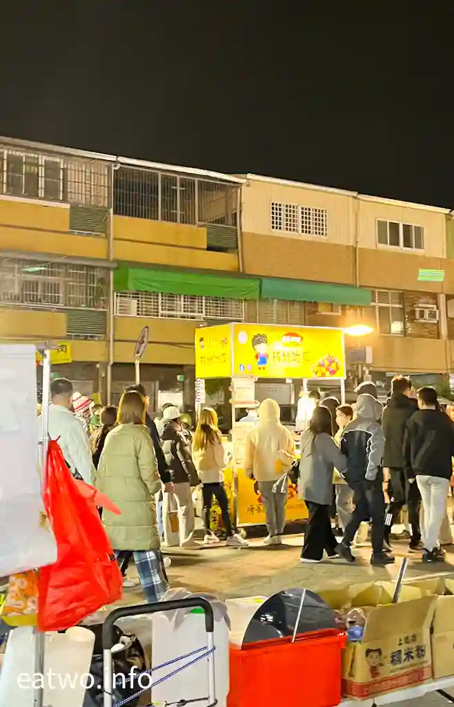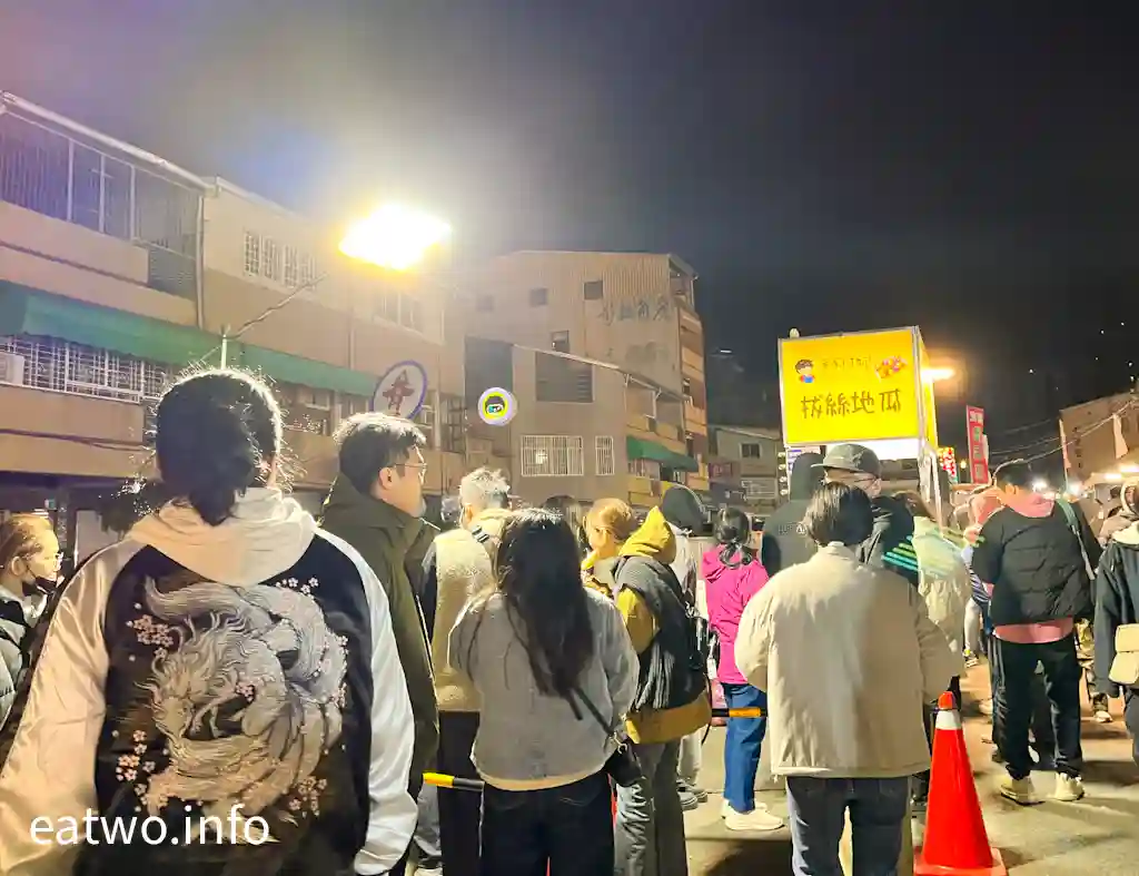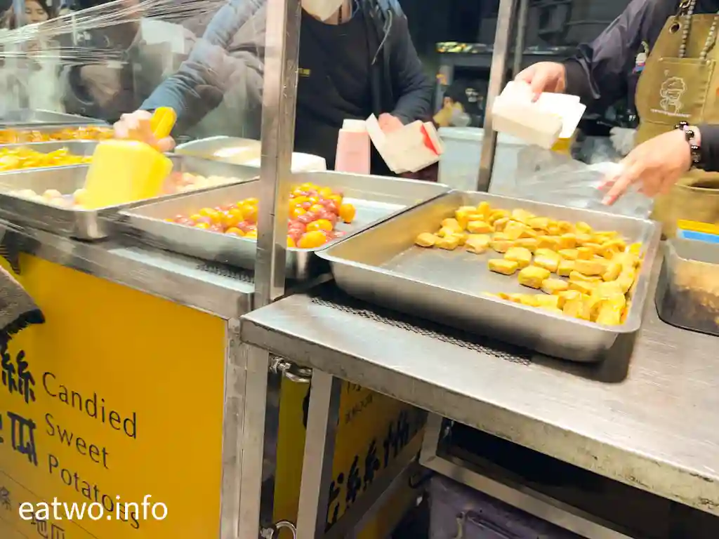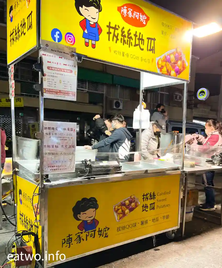 講到排隊店,不得不提「陳家阿嬤拔絲地瓜」,門口旁邊直頭拉晒幾行畀人排隊。本來見到太多人打算一陣再食,不過當日返轉頭發現該店賣晒收工,未能一試,最終到其他夜市先食到。故此,強烈建議排咗先算、食咗自算!該店係拔絲薯條、QQ球創始店,有拔絲地瓜、芋頭、薯條、QQ球選擇,每份TWD50至100,分別可以揀12顆、24顆同款,或者兩種、三種、四種mix埋綜合口味,有唔同數量。而新年期間另有拔絲湯圓TWD50至100,平時就無得賣。拔絲地瓜其實就係蕃薯外面以薄脆糖衣包裹住,就似麥芽糖,令整體更有香甜味。