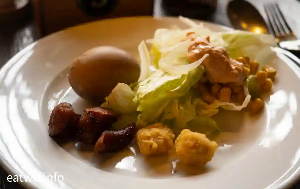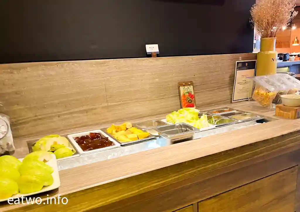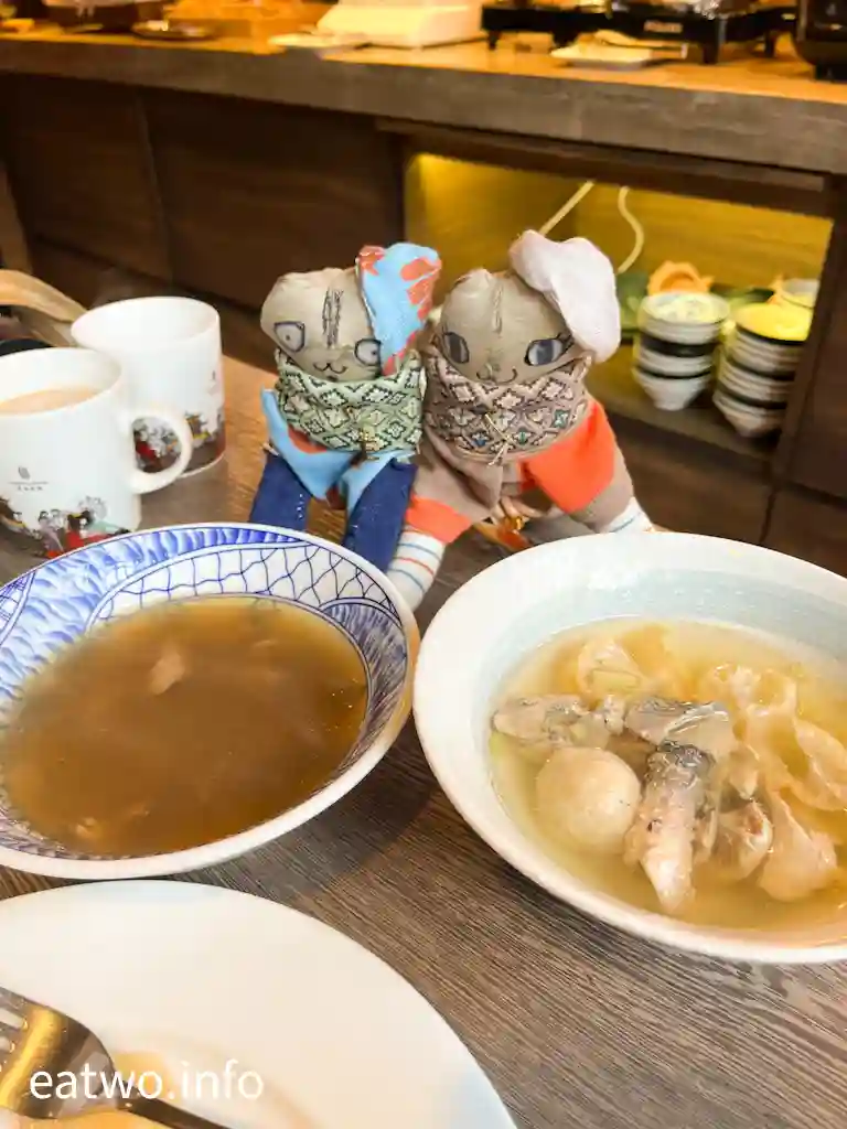 飯店餐廳早餐限定有新鮮虱目魚湯、台南牛肉湯、營養豐富嘅素食鮮菇湯,每人可以三選一,故兩個人就可以揀2款菜式,另可加點滷肉飯。虱目魚湯、牛肉湯其實唔輸蝕於外面專門店嘅質素,兩個湯都好清甜,唔油膩,魚肉同牛肉入口皆軟嫩。自助吧比較特別嘅係府城古早味肉燥飯、咖哩醬意麵,飲料吧就有聯乘之作義豐冬瓜茶,其他飲料就有米漿,以及採用ucc咖啡豆嘅咖啡。