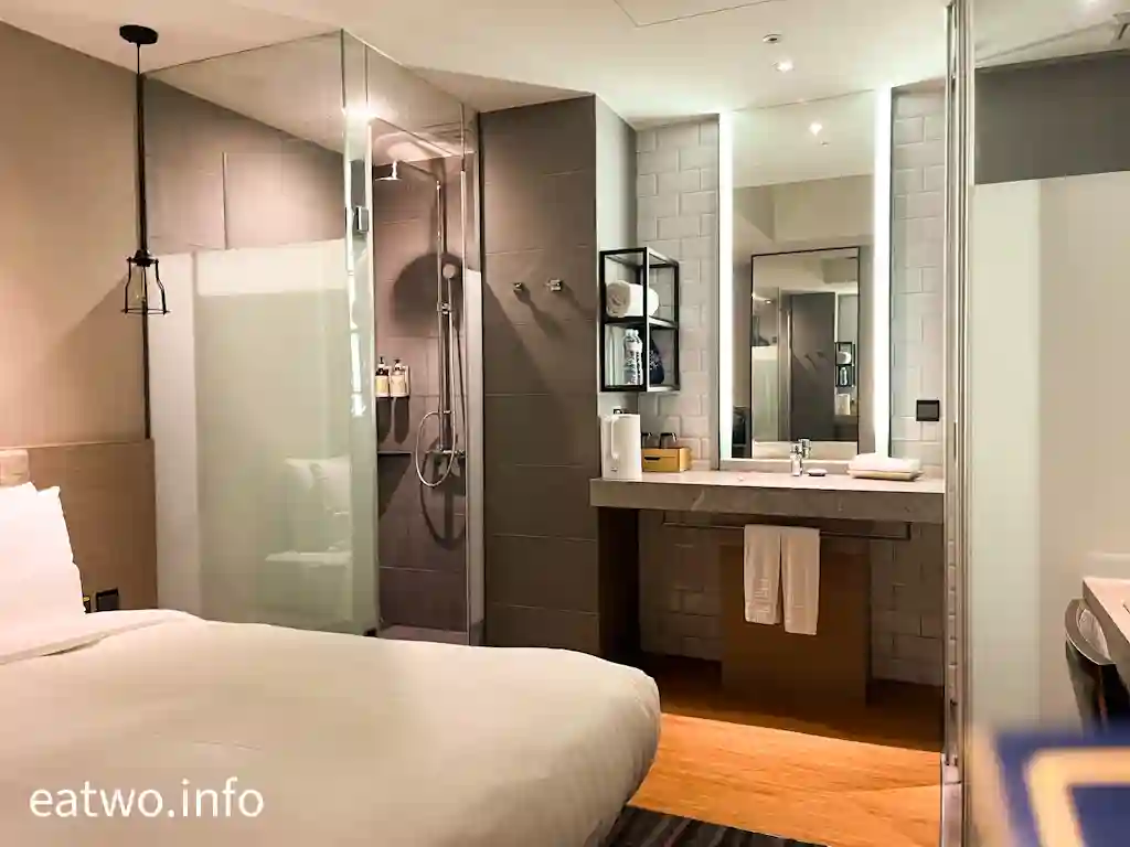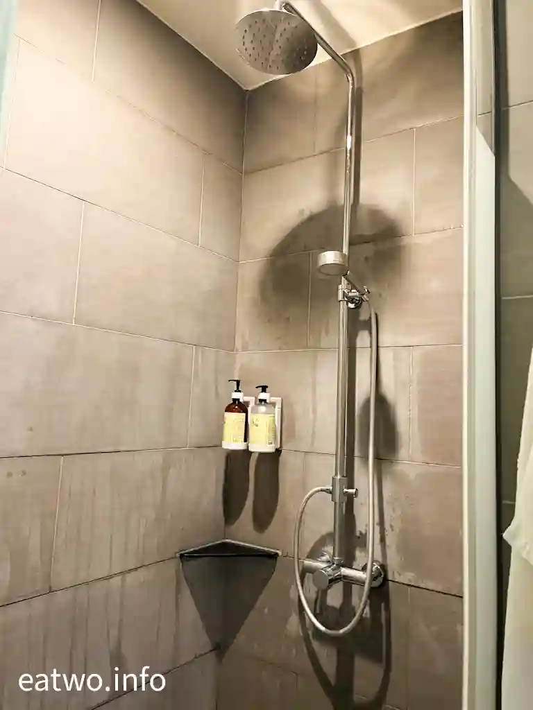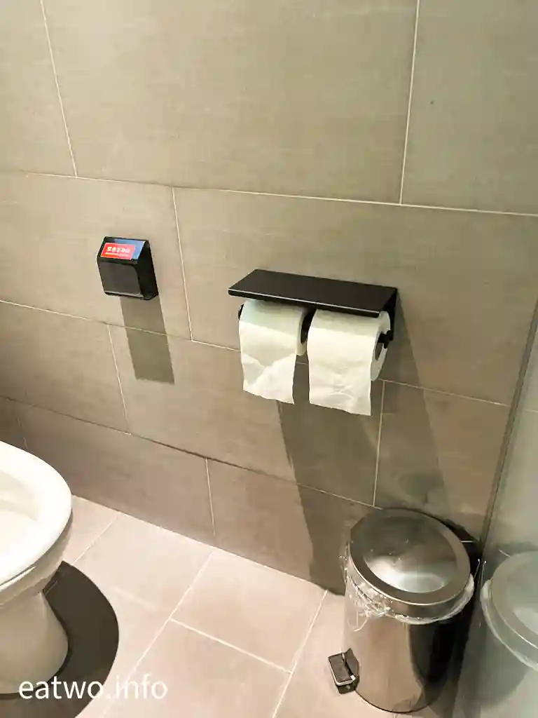 房間浴廁乾濕分離,以中間洗手盆分隔,浴室有提供沐浴露、洗頭水,水壓充足,而廁所嘅廁紙就離奇地多,唔單止有兩卷擺喺度,後面重有後備廁紙。雖然浴室無提供即棄盥洗用品,但房間衣架下面就有提供即棄拖鞋。浴室內有個220V插頭,因為風筒同熱水壺都係用呢種插頭。而220V正正係香港使用嘅三腳插頭,所以就算你唔記得帶轉換插頭,入住呢間飯店都唔需要擔心無得叉電,當然唔好連普通插頭都唔記得帶啦!