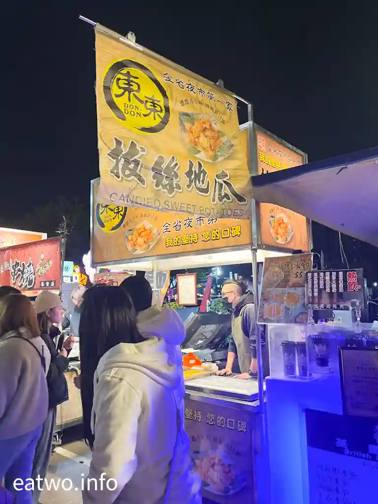 「花園夜市」有一間人氣十足嘅小吃攤,狹窄小巷內嘅「東東拔絲地瓜」都依然大排長龍!該店寫明全省夜市第一家,更標明有濃濃古早味,絲絲新口感。一份拔絲地瓜每盒TWD50,唔單止「花園夜市」逢星期四、六、日有營業,而「大東夜市則於逢星期一、五營業,連TVBS同「食尚玩家」都有訪問過。