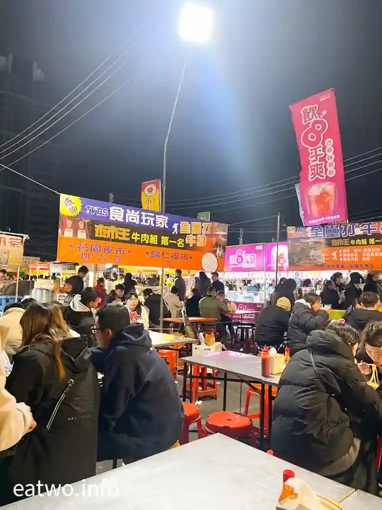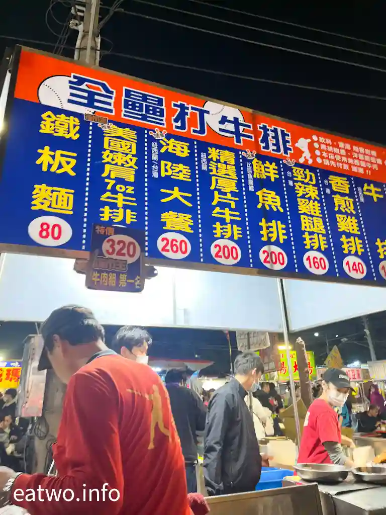 夜市內有唔少堂食座位,可以畀客人坐低歎,唔使一定立食。除咗剛才提到嘅「銀河碼頭岩燒x酥皮濃湯」,重有「全壘打牛排」。呢間牛排店唔單止受到台南在地人歡迎,連TVBS、食尚玩家都有報道,獲封為「夜市王牛肉組第一名」,內有鐵板麵TWD80、牛排TWD140,每塊都有一定厚度,最貴係美國嫩肩7oz牛排都係賣TWD320,價格極親民!該店選用紐西蘭牛肉,每一份牛排都會附送飲料、玉米濃湯,甚至可加麵,可以食到飽,牛排更可配搭黑胡椒醬、洋蔥蘑菇醬。呢間牛排店於「花園夜市」係逢星期四、六、日營業,而「歸仁夜市」就於逢星期三營業。