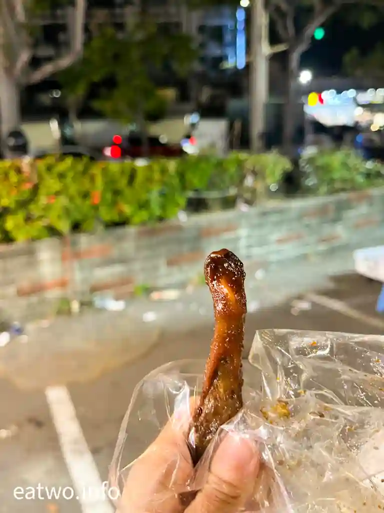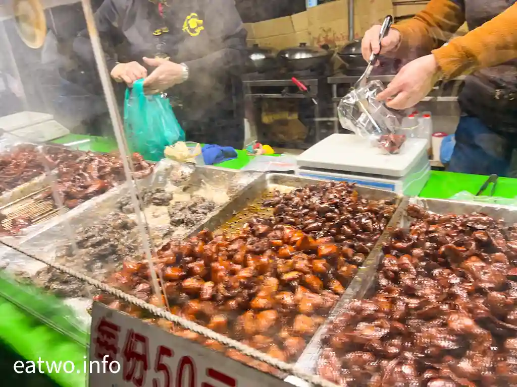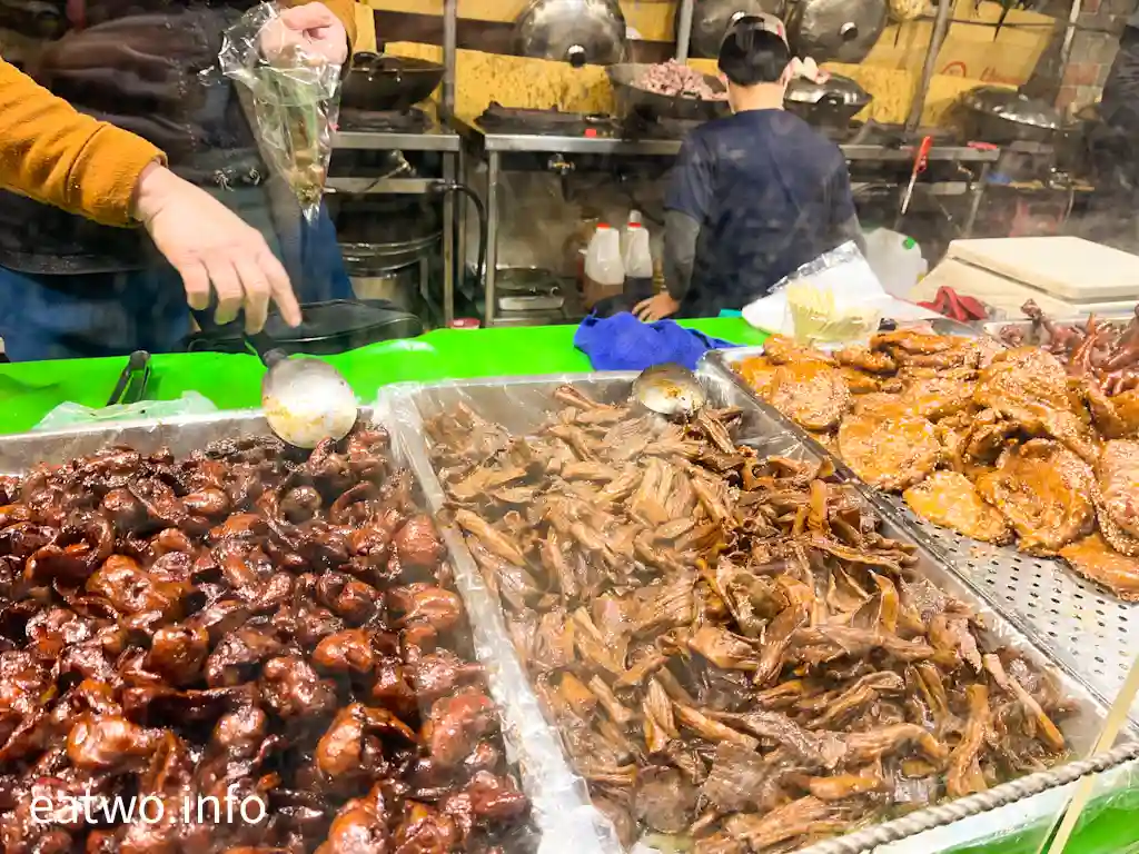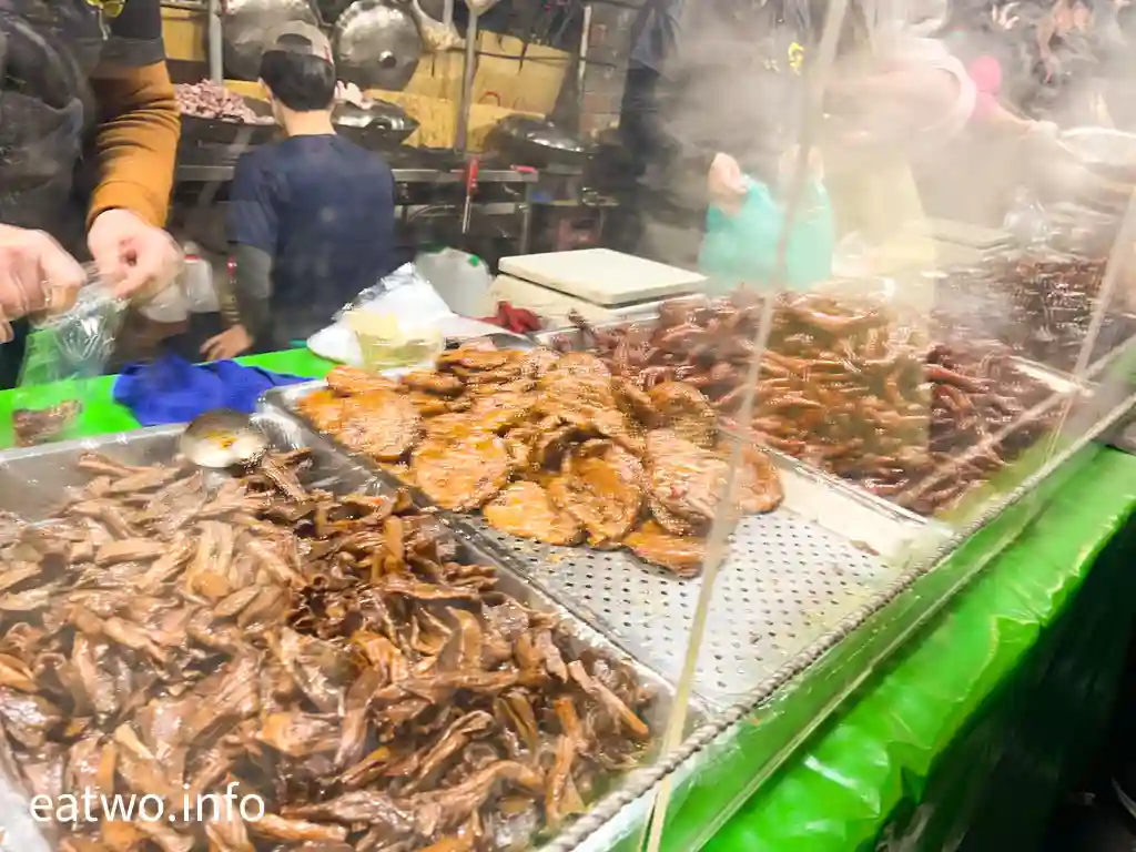 講到人氣極高嘅小吃攤,一定要選「二師兄古早味滷味」,打橫長長攤位配合上方嘅banner,非常顯眼。而玻璃後面有幾條隊等候,客人會逐個買。店內有雞翅、三杯鴨舌、棒棒腿、雞爪、鴨翅、雞心、雞肝等,每份TWD30至50,而雞翅、棒腿就賣TWD20一支或TWD100六支,鴨舌就賣兩支TWD30。滷味現場製作,人手頗多,每件都滷得非常入味,又唔會有味精、色素等添加物,入口卻鹹中有甜,滷得通透,又真係難怪啲人排隊買嘅。