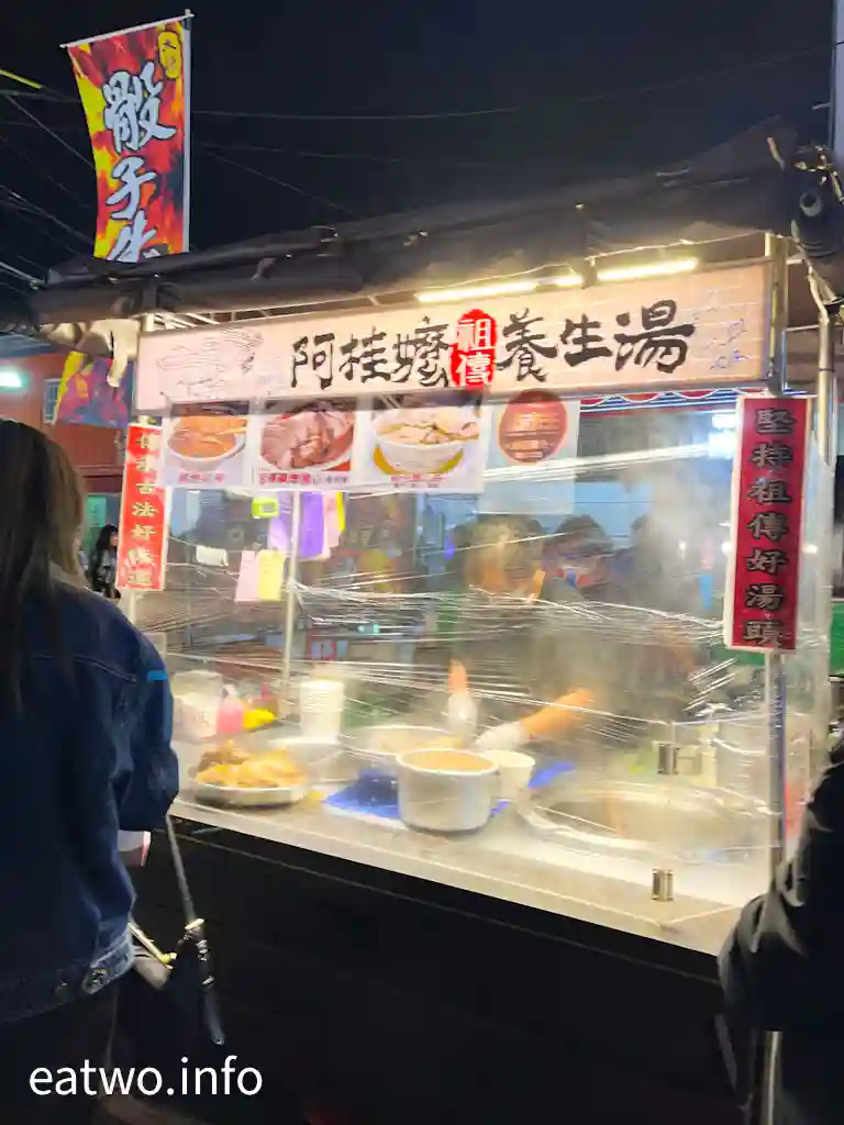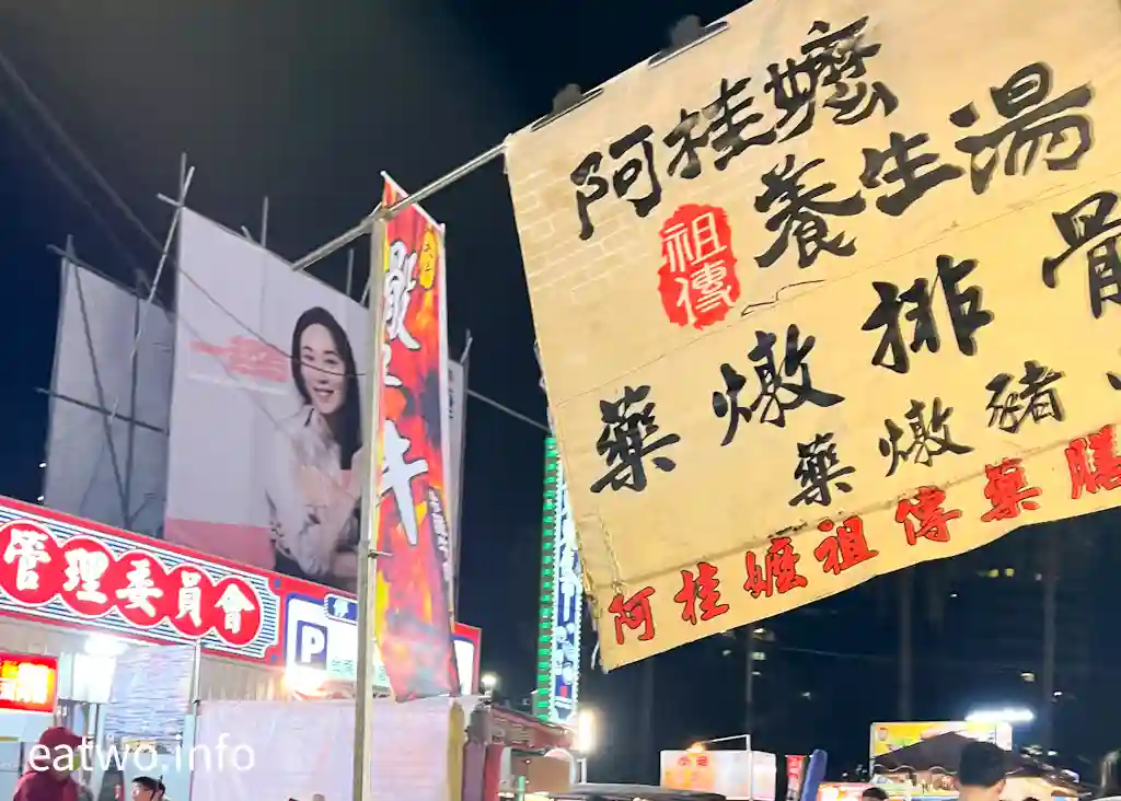 而「阿嬤祖傳養生湯」亦係台南人喜愛嘅小攤之一,主打係藥燉排骨、藥燉豬心,即係藥膳湯水,如果於夜市食得太熱氣嘅話,不妨去飲碗湯啦!另外,重有「法式鐵板」嘅有厚片牛排、無骨雞腿排、豬排,賣TWD70一份至130兩份;「鹽焗長」就有鹽焗蝦、鹽焗魚TWD250;「烤我燒烤麻糬」一份賣TWD35至100,可以選擇唔同口味。夜市內有唔少小吃攤都獲得「食尚玩家」推薦報道,例如「武聖夜市」都有嘅超過40年老攤「三輪車大腸香腸」;每份TWD70至100嘅「延記臭豆腐」;獲封花園夜市美食排行top3嘅「阿三哥蚵仔煎」,有四草蚵仔煎TWD70;46年老店「紅妃香腸大腸」每份就賣TWD70至140。