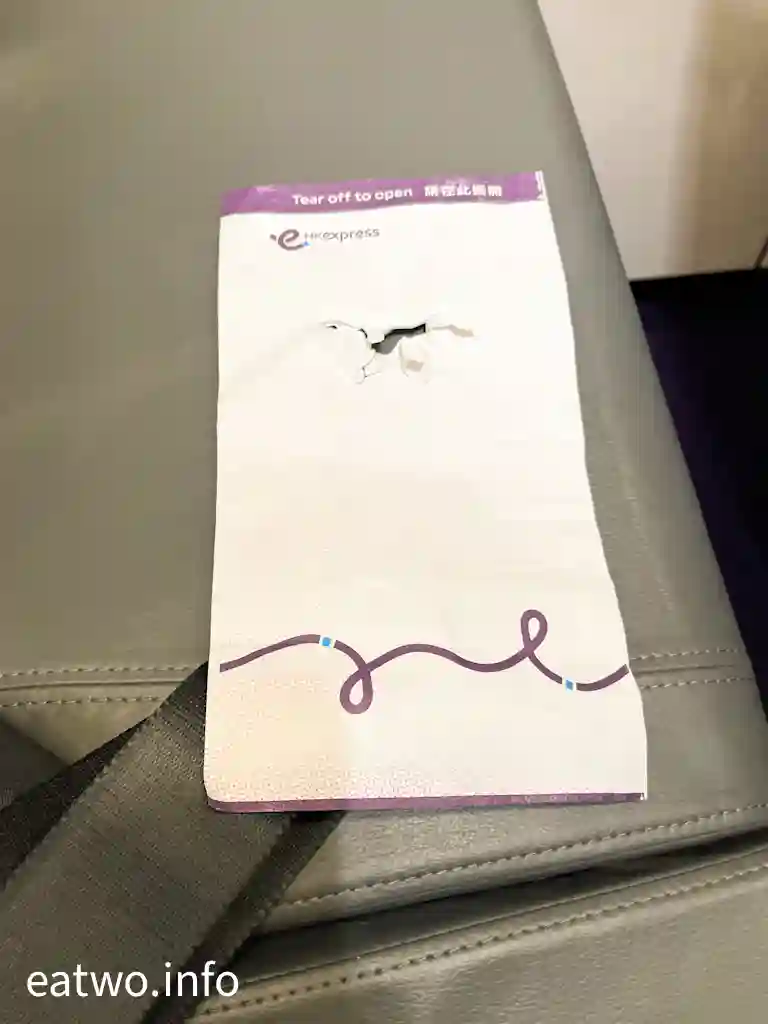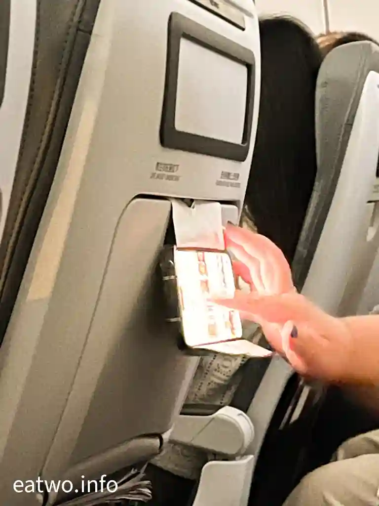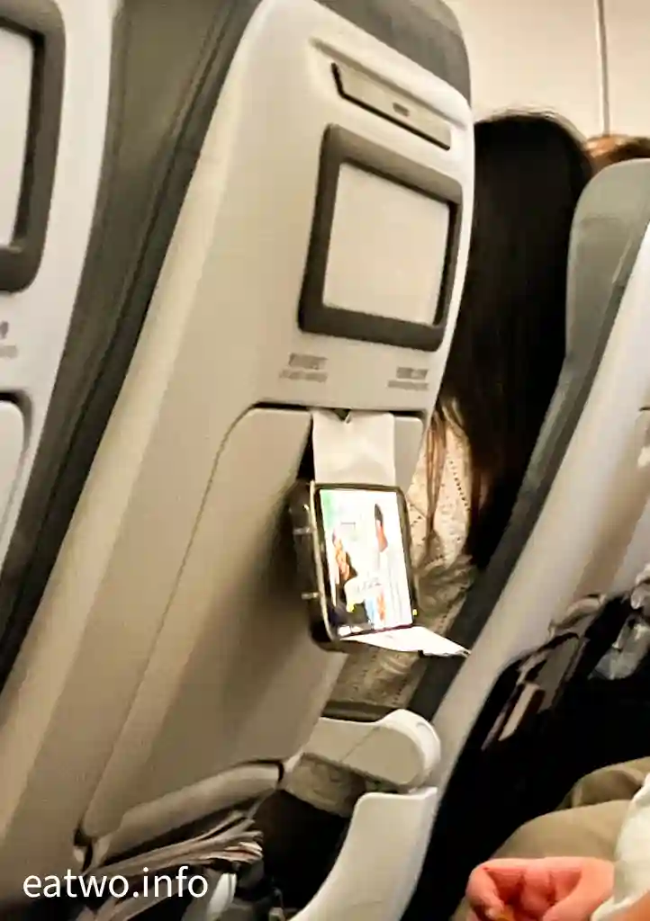 原先以為小紙袋只係用作擺放垃圾之用,但旁邊乘客嘅舉動,令我哋相當意外。乘客利用飛機上提供嘅小小垃圾袋,一端攝喺前面椅背嘅餐檯內,中間就攝入手機同機殼之間,手機就可以固定位置於正中心。咁樣擺放手機,就好似平常航班上椅背後嘅mon。