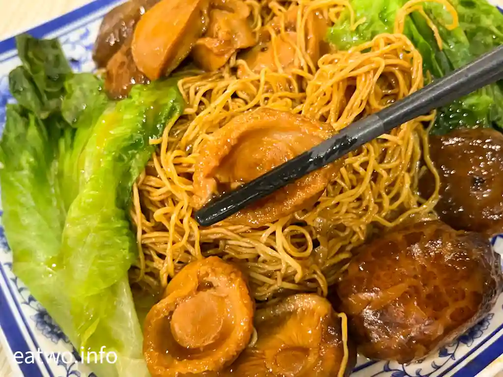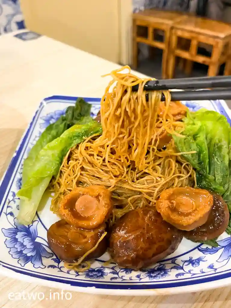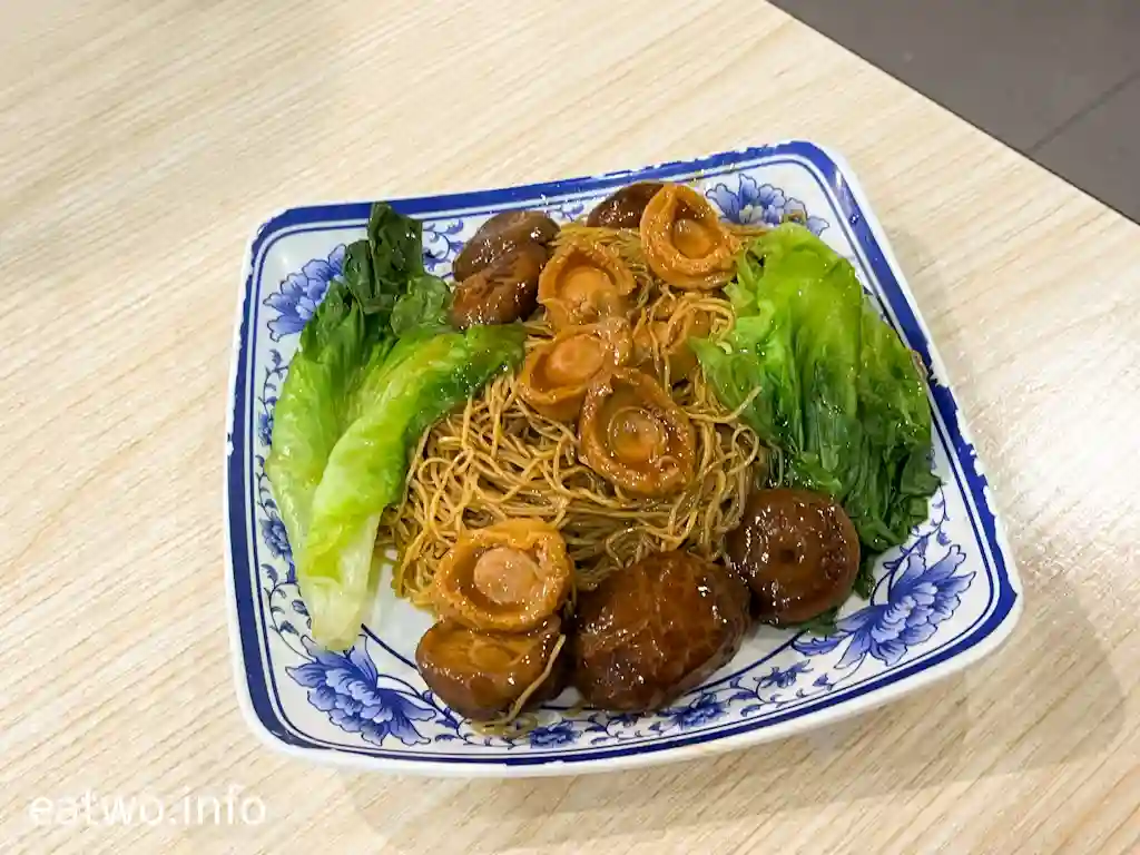 蠔皇鮑魚冬菇撈麵$78,上檯一刻就好似交咗智商稅一樣,原來就係茶記撈麵上面加上罐頭鮑魚,以及細冬菇同生菜底。鮑魚size比14頭鮑更加細,同罐頭鮑無異。撈麵啲汁就好似平時啲罐頭鮑魚入面嘅汁,即係平時自己會整到嘅罐頭鮑魚撈麵。選料來自自家海味?求證實。