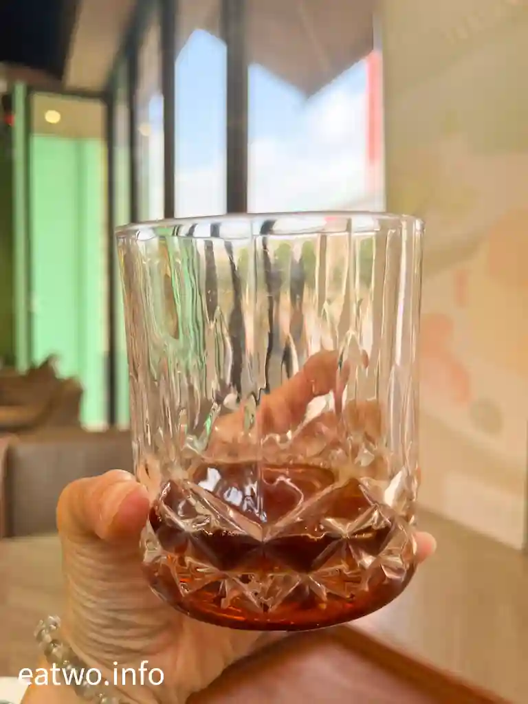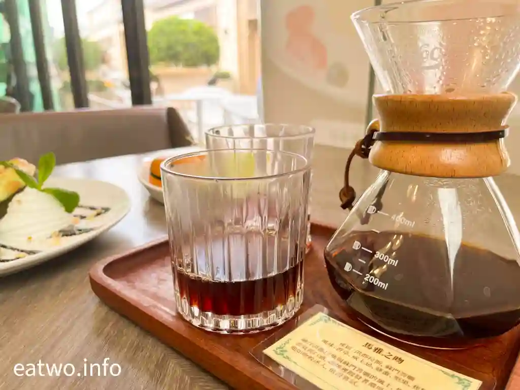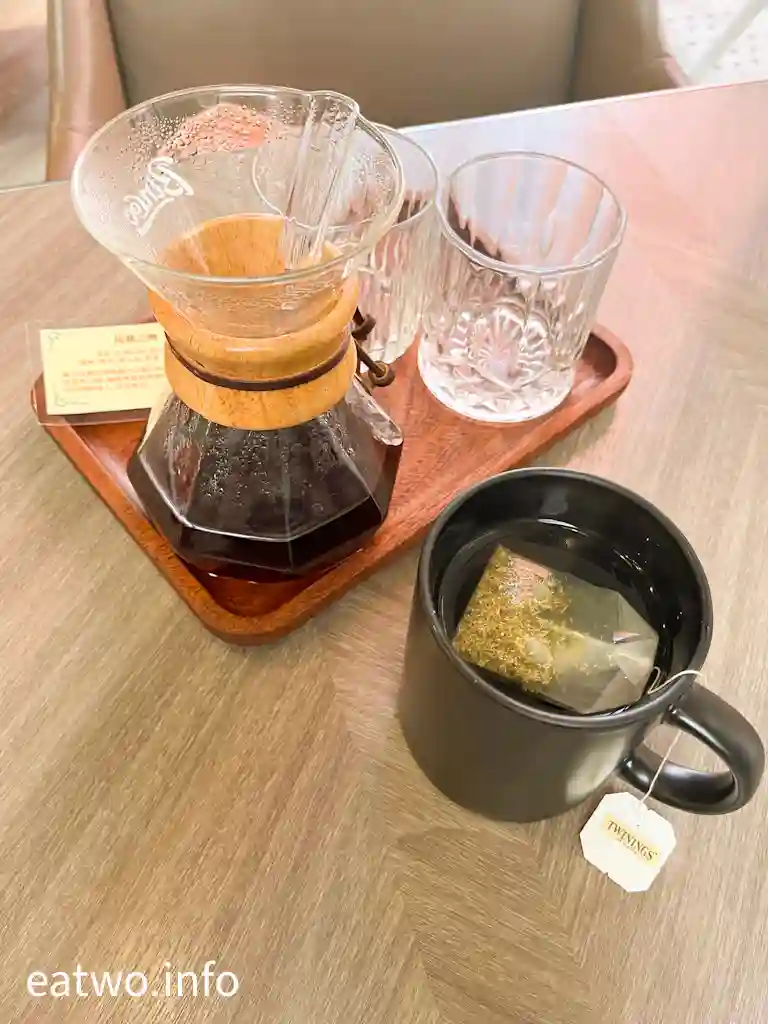 花茶其實只係茶包嚟,Charmomile 洋甘菊花茶$32,就正常一杯熱茶。氣泡咖啡$43 有3款口味,分別係檸檬、橙、柚子,三重柚子氣泡咖啡,底層有好多柚子碎,上面係梳打水同咖啡混合,比較重柚子味。較特別嘅係3款精品咖啡,分別係馬雅之吻$60、曼巴$55、J&B特配$45,今次揀馬雅之吻Kiss of Maya,寫明來自洪都拉斯、蘇門答臘,由香草、威士忌、蜂蜜、堅果、焦糖組成。咖啡擺放壺中,斟出嚟依然有熱氣,咖啡入口有少少香草香同酒香,好彩有啲酒味揮發咗,唔係好重。精品咖啡比一般咖啡貴一倍,但咖啡豆同水溫控制係比較有水準。