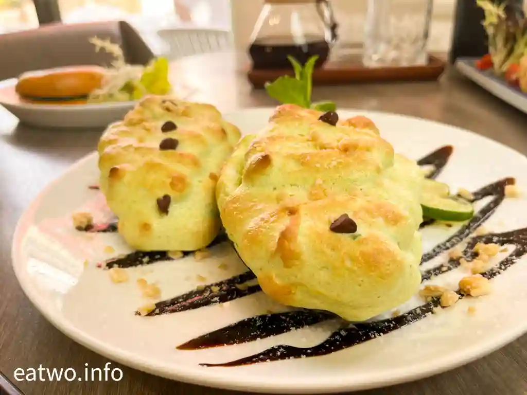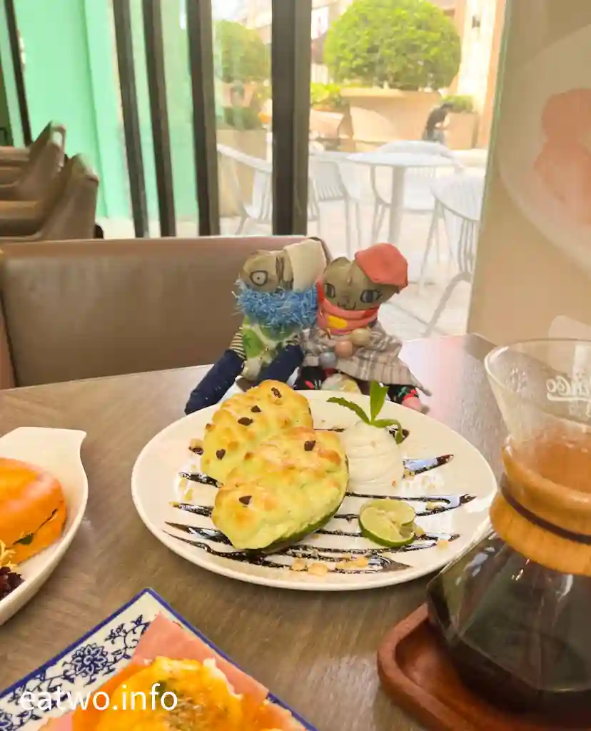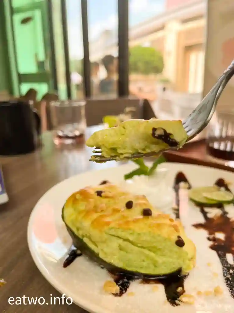 E.A.Two比較意外嘅係梳乎厘班戟,但唔係原味梳乎厘配水果,或者抺茶紅豆梳乎厘,反而係牛油果梳乎厘配堅果碎。皆因呢款梳乎厘唔單止有牛油果味,亦都係擺放喺真實牛油果皮入面,左右有兩件,果然名副其實牛油果梳乎厘!雖然係原個牛油果份量,賣相係一流,但份量上好似少過正常一碟梳乎厘少少,不過梳乎厘質感的確係鬆軟。