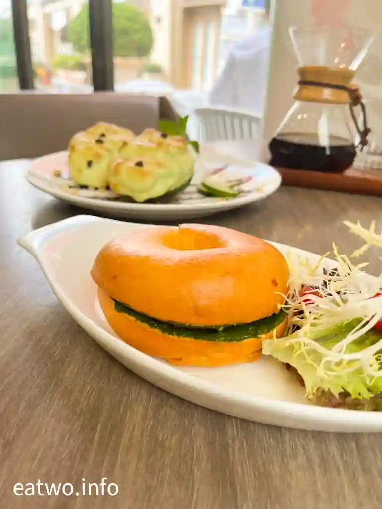 店內輕食中有8款口味貝果,每件$22,包括原味、藍莓、葡萄乾、伯爵奶茶、雜錦果籽、肉鬆芥末、風乾蕃茄芝士、蔓越莓,而加cream cheese就要加$10。cream cheese口味包含原味、肉桂、開心果、藍莓,今次揀咗風乾蕃茄芝士配開心果醬。Bagel係打橫對半切開,質感比較乾身,呢款風乾蕃茄芝士味唔係太明顯,堅果碎好似模仿開心果嘅質感,入面開心果醬份量頗多,餡料係比較甜。