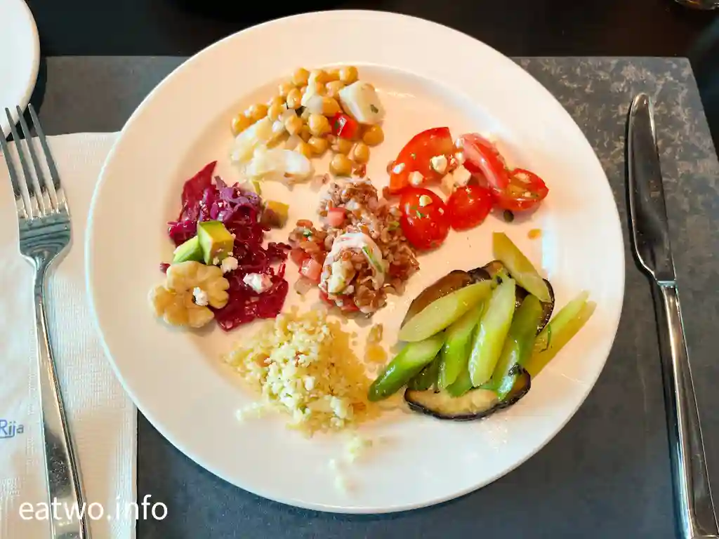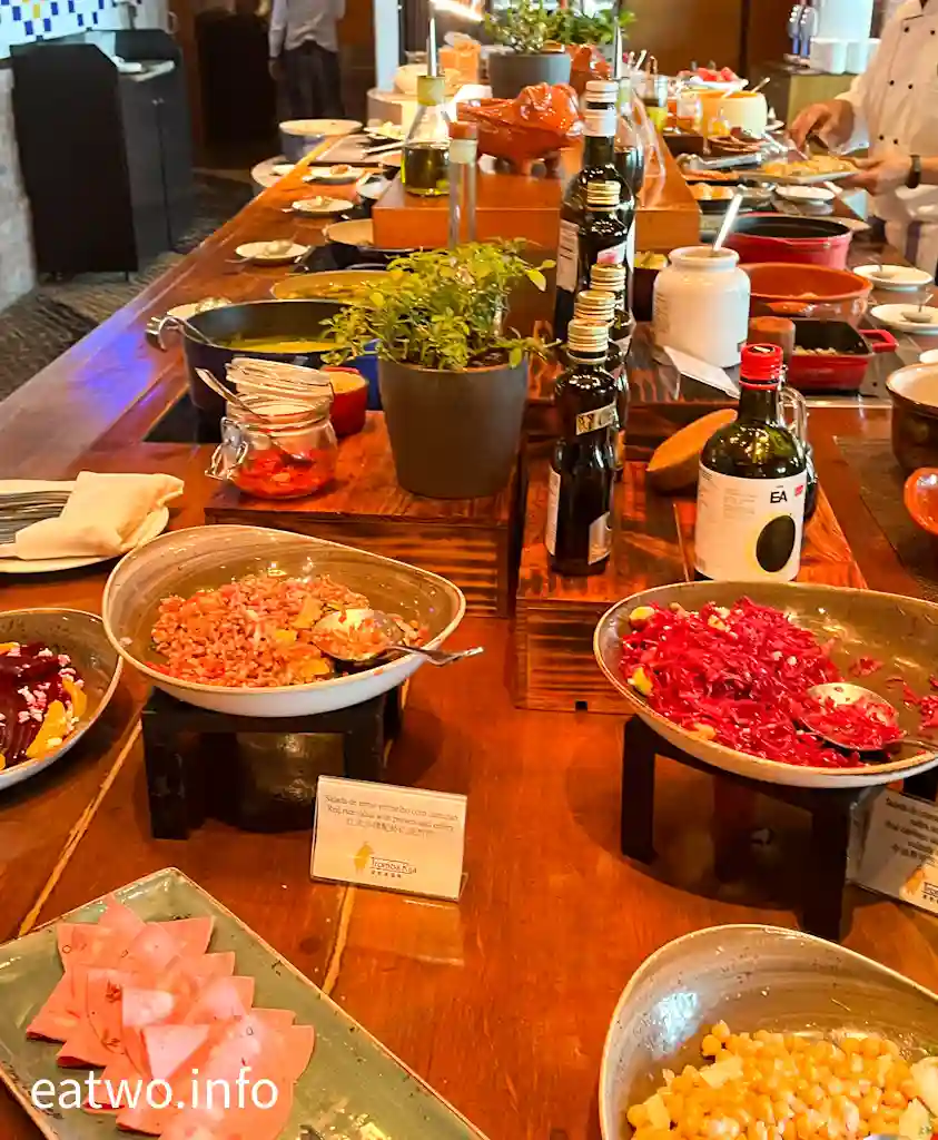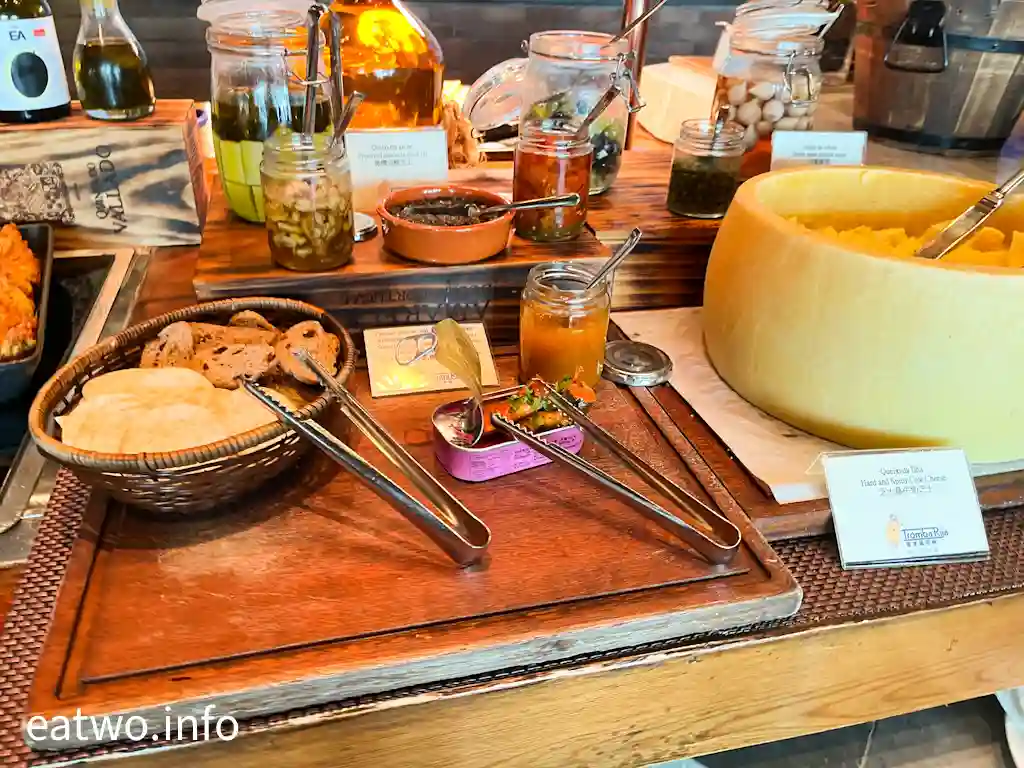 既然係全自助餐模式,當然要走出去攞嘢食,大多數菜式同葡國菜有關,好多都係採用葡國食材,無咩海鮮、魚生、凍盤等西方菜式。當中,沙律菜款式堅有誠意,沙律款式眾多,而且每一款都唔係隨便撈埋就算,好少見到沙律吧位置有咁多款獨特沙律菜。除咗可以自製沙律、精選雜菜沙律,更有開心果羊芝士車厘茄沙律、蘆筍藜麥沙律、紅米沙律配蝦仁及西芹、牛油果羊芝士紫沙律、芝麻菜配火腿蕃茄及核桃、北非米杏仁沙律配葡萄乾羊芝士及蔥等,睇嚟不時會有變化,因為餐牌比現場更多選擇,其他選擇應該重有紅菜頭沙律配香橙及羊芝士、吞拿魚沙律伴眉豆蕃茜及洋蔥、雞心豆牛油果紫洋蔥沙律、豬耳件芫荽及甜椒、三文魚意粉沙律等。最難得嘅地方,係每一款沙律唔單止賣相精緻,而且都係入得口,配搭適宜,好fresh。