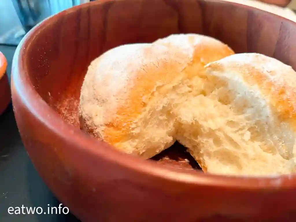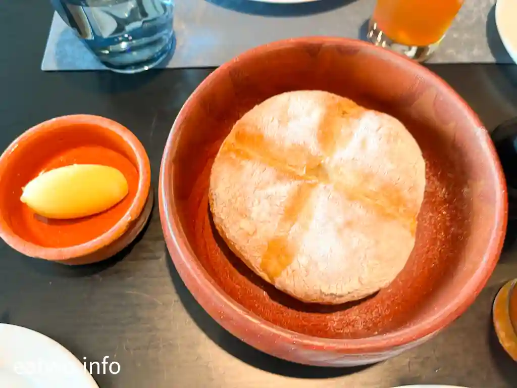 甫入座,侍應就放上一款葡萄牙軟麵包,再配搭無鹽奶油,另外每人都有一杯混合檸檬茶。麵包大小就同小學生塊臉差唔多,撕開可以每人兩嚿。雖然表面烤得比較乾硬,更灑由麵粉,但撕開後就發現內裏係頗為鬆軟。麵包必須配上奶油,否則其實無咩味,好似食白麵包咁。而檸檬茶亦有驚喜,入口滲出檸檬香,亦有紅茶味,難得係無冰粒都冰涼。