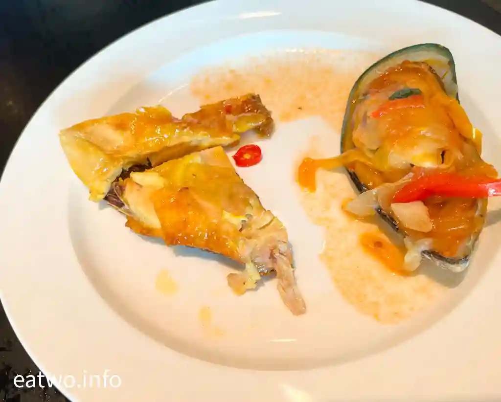 當日午市選擇重有燒沙甸魚、紅油炆牛肉伴甘筍及青豆、香腸雞蛋酥、黃薑肉碎包、薯蓉燴豬肉、炆黑毛豬面頰肉配薯茸、燴海鮮飯等,鹹點中真係無邊款係令人覺得中伏,呢方面甚至真係幾精彩。當中重有兩款特別菜式,分別擺放近廚房窗口,包括波椒白酒煮青口、辣椒汁烤雞,兩者都夠惹味,醬汁調配料調校適中,烤雞嫩滑之餘亦唔會好辣。不過葡國雞或非洲雞好似唔係來自葡萄牙,而係澳葡菜,簡單嚟講就係Fusion菜。