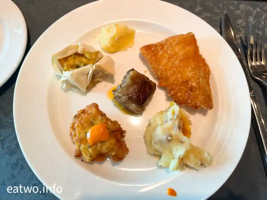 餐牌上有薯茸青菜湯、南瓜湯、花椰菜馬鈴薯湯,但當日就只有薯茸青菜湯,湯汁濃稠,唔係液體狀,配料不少。而芝士都係幾有驚喜嘅選擇,比如橄欖油醃芝士、芝士島牛奶芝士,入口好重芝士香,竟然唔會好膩。