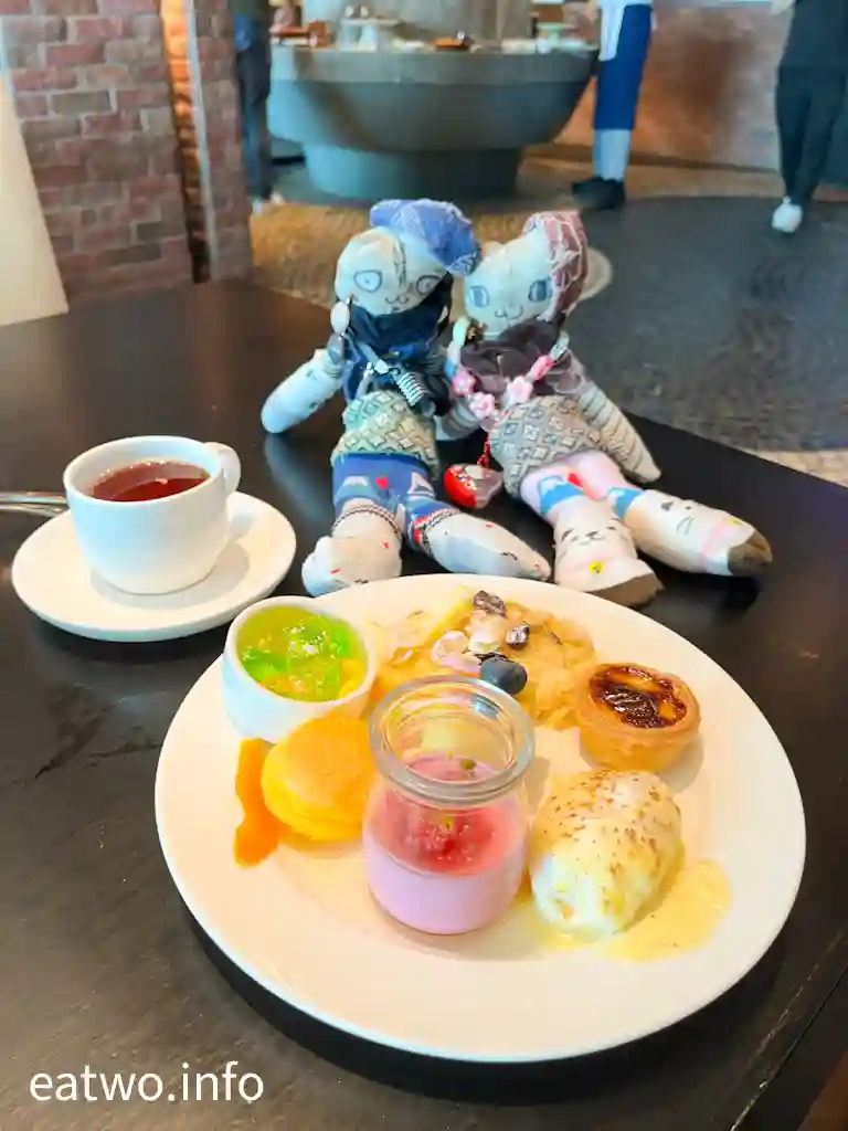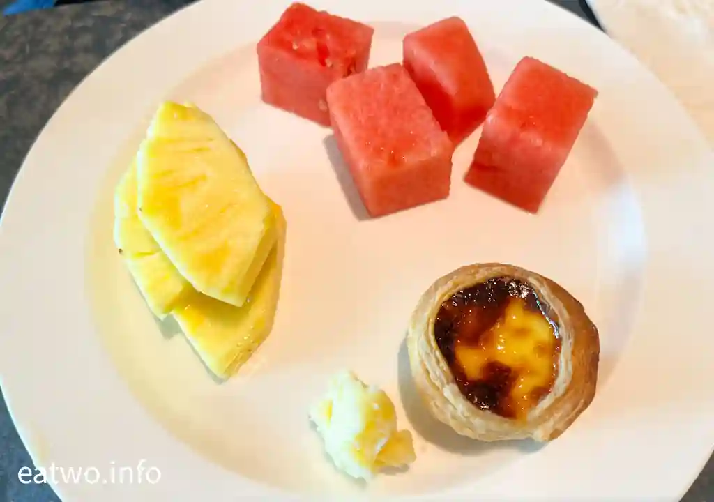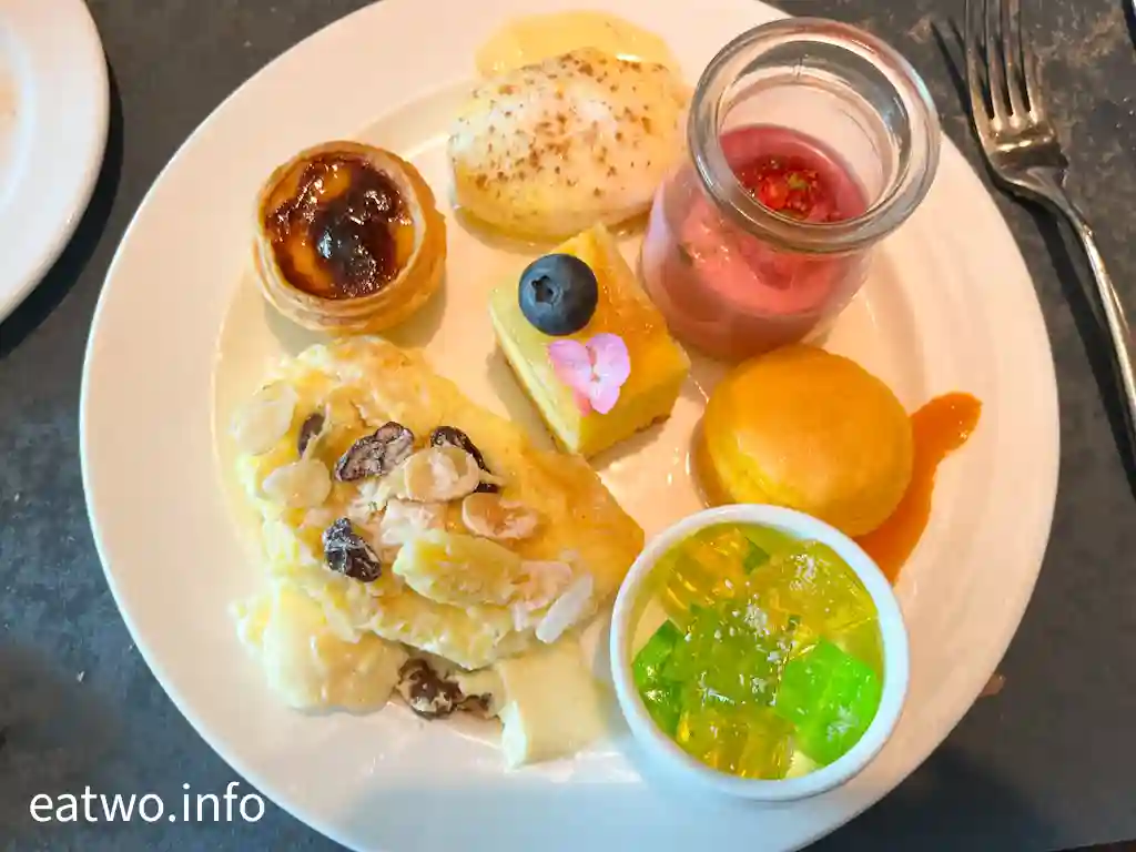 鹹點精彩程度的確要豎起手指公讚好,令甜點比較遜色。餐牌上有唔少甜點,例如砵酒燴梨、栗子朱古力撻等係未見蹤影。當日就見到有芝士肉桂焗蛋白、朱古力慕斯、焗蛋白配吉士及肉桂、蛋黃糖漿烤杏仁、楓核桃芝士蛋糕、朱古力車厘子軟蛋糕卷、葡式蛋撻、朱古力brownie、反轉菠蘿蛋糕、芒果青檸啫喱、桑子布甸、麵包布甸,水果就有西瓜、蜜瓜、菠蘿可以選擇。甜點其實無特別印象深刻,美中不足係葡撻唔夠熱力,擺到涼晒,如果擺放保溫嘅地方就會更好。當中,芝士肉桂焗蛋白、麵包布甸就比較穩陣。
