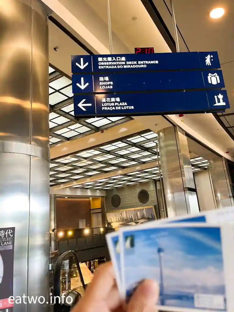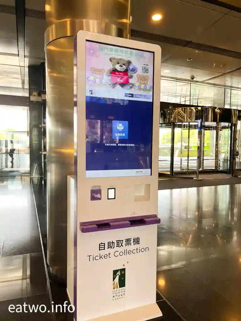 歎完自助餐,走出餐廳折返入口方向,自然會見到一部自助取票機。打開返KKDAY事前嘅憑票證明QR Code,按指示就可以直接取票,完成步驟後,部機就會吐出「澳門旅遊塔」入場券,整個過程都唔需要額外再付款。自助餐廳雖然位於大樓地面,觀景台就位處58樓、61樓,只要乘搭電梯,就可以直接登上「澳門旅遊塔」觀景台。