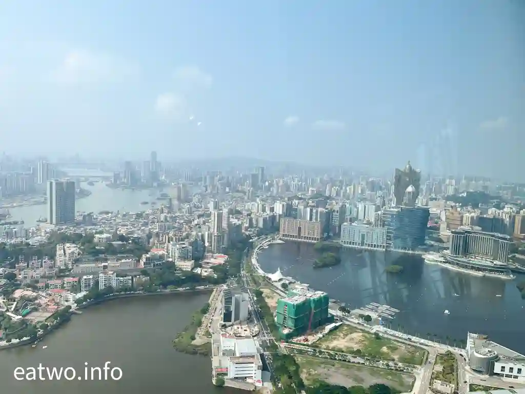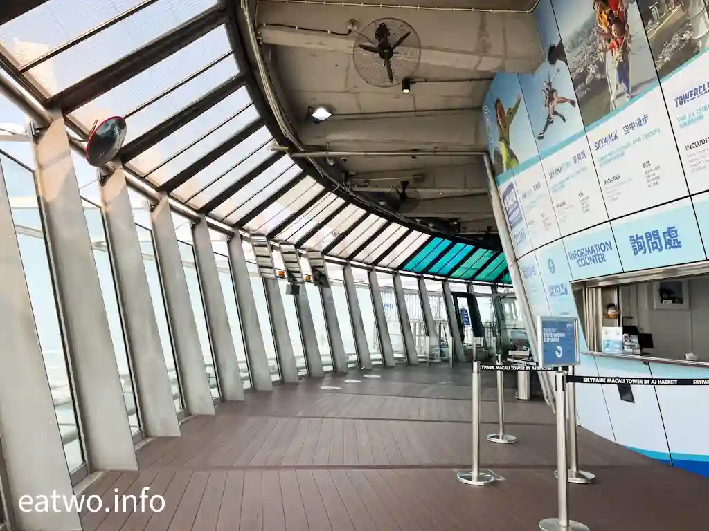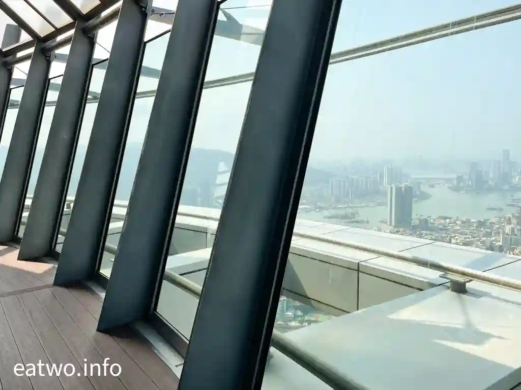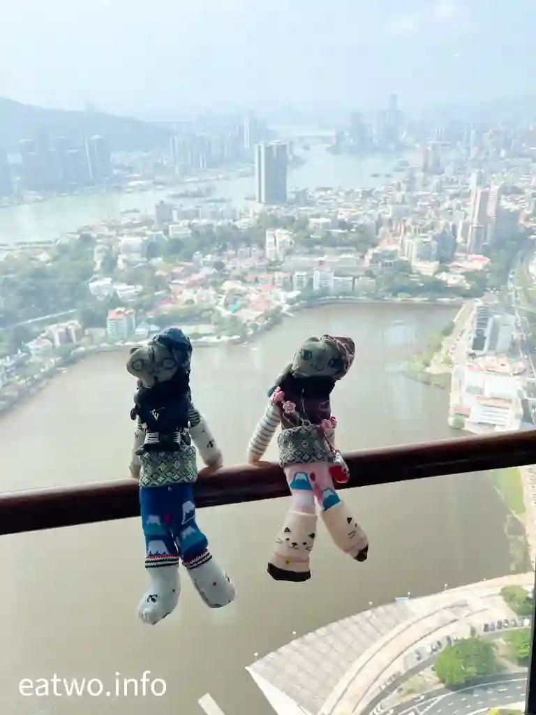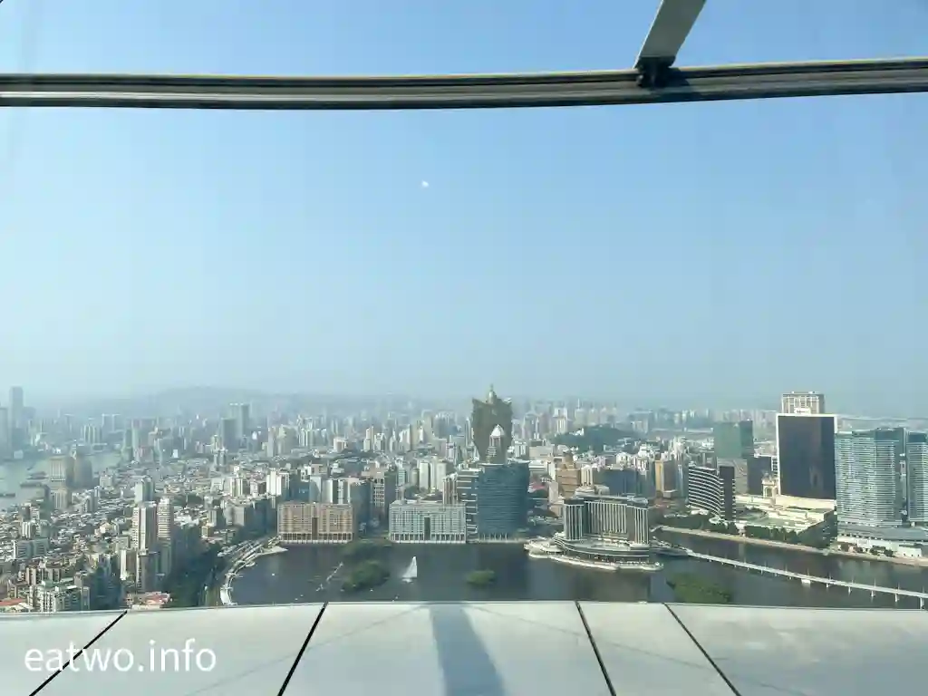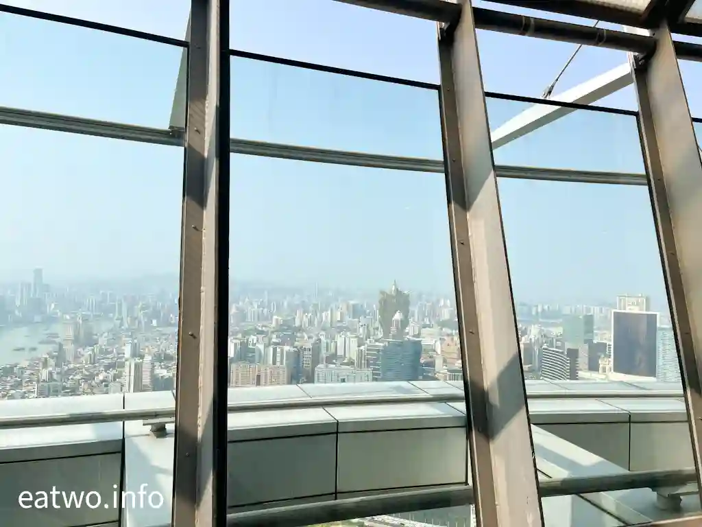 「澳門旅遊塔」有約338米高,係澳門知名地標同觀光塔,其實比巴黎「艾菲爾鐵塔」、澳洲Sydney「AMP Tower」、奧克蘭「Sky Tower」等更高!先登上58樓,呢一層依然係室內空間,但走一個圈,就已經可以360度環瞰澳門全景!呢一層樓四面八方都係落地大玻璃窗,景觀係比較遼闊同清晰,摩天大樓、葡式建築物、海岸線皆一覽無遺,只係需要隔住玻璃觀望。