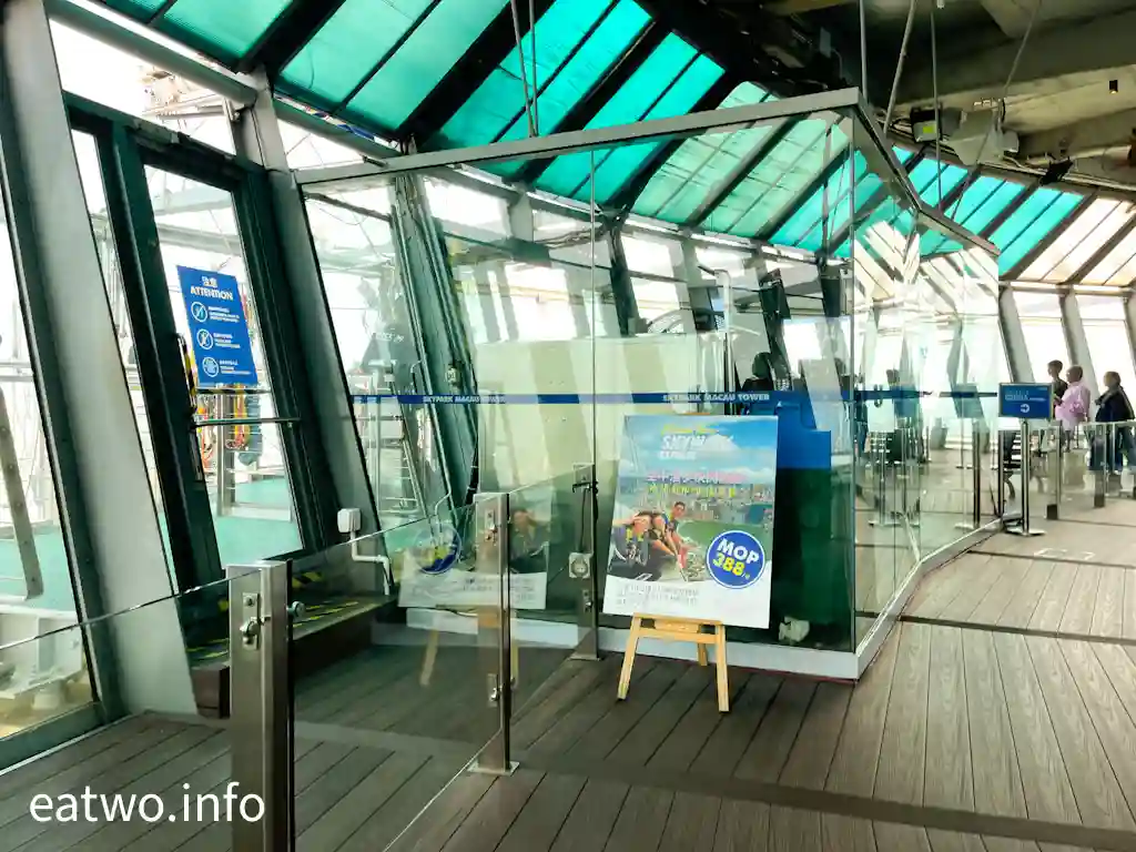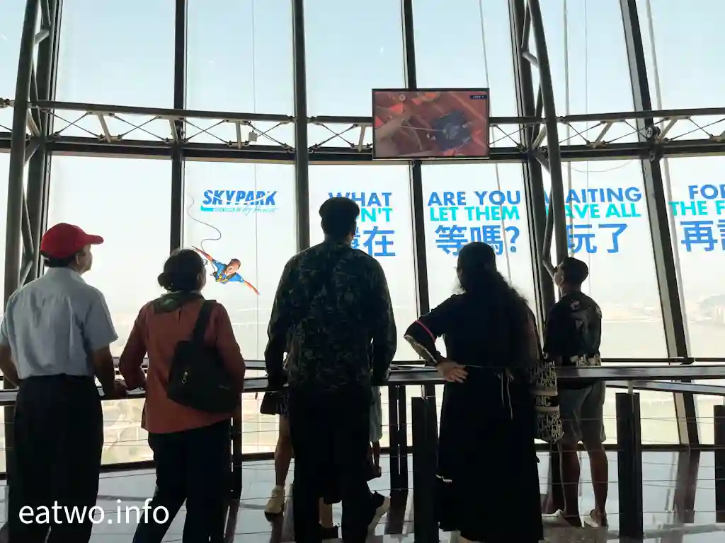 從58樓觀景台處抬頭,會發現上一層樓就係大型旋轉餐廳,同樣可以享有澳門360度全景!而58樓層數嘅觀光廊唔單止可以前後左右環瞰全澳門景色,亦可眺望珠海,甚至回望香港大嶼山風景,日夜景皆適宜。另外,58樓更可以睇電視直播,望到上層準備跳Bungee Jump嘅情況,當時有咩人要跳笨豬跳都一清二楚。