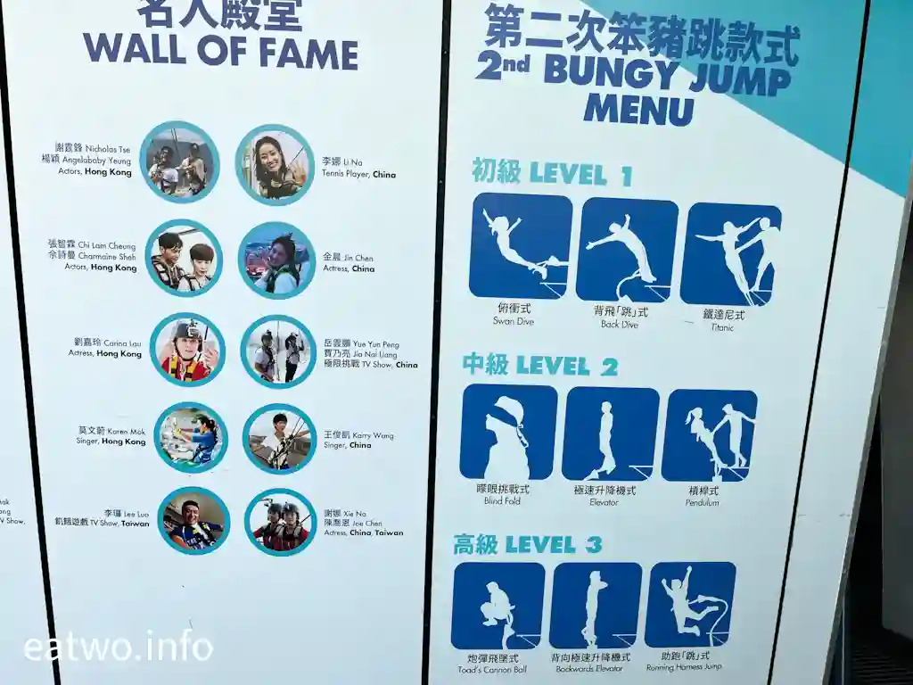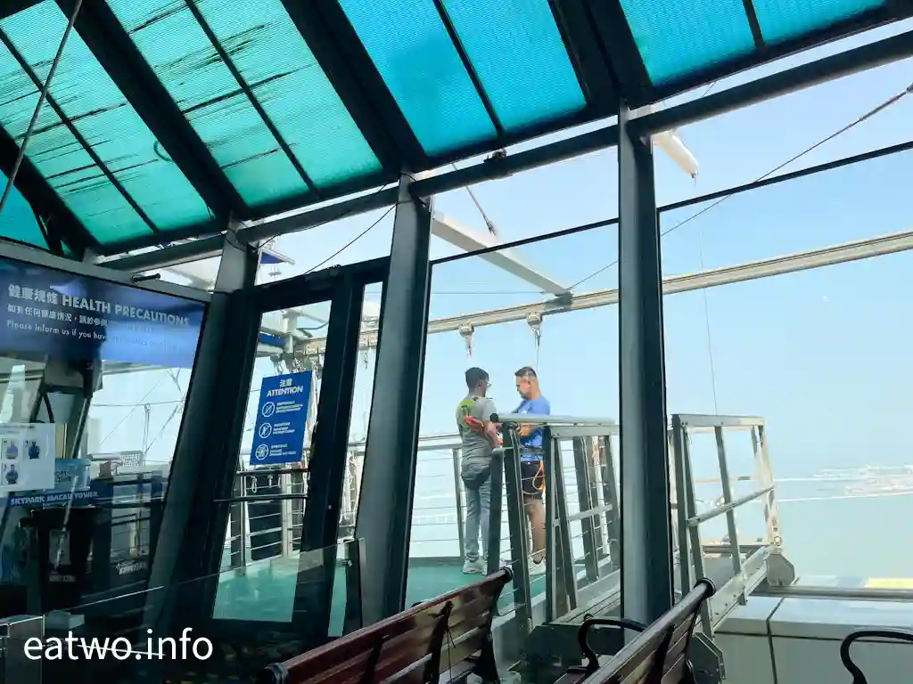 而繼續上行至61樓,就係一個戶外觀景台,離地有223米高!呢個位置亦係各式活動嘅入口處,例如係跳笨豬跳、高飛跳、空中漫步、百步登天,不過全部都要額外付費參與。自問無膽匪類,所以我哋只係於觀景台賞景,同埋食花生睇人跳Bungee。而61樓觀景台有一部份其實被外面平台遮擋景觀,只有一半位置可以隔玻璃窗完全下瞰澳門風景。