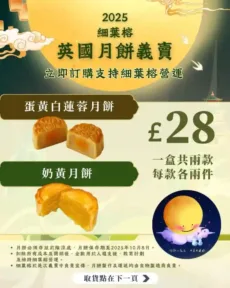蛋黃白蓮蓉月餅 (4件禮盒裝) £ 34 / HKD 352(原價£ 36.5 / HKD 377)