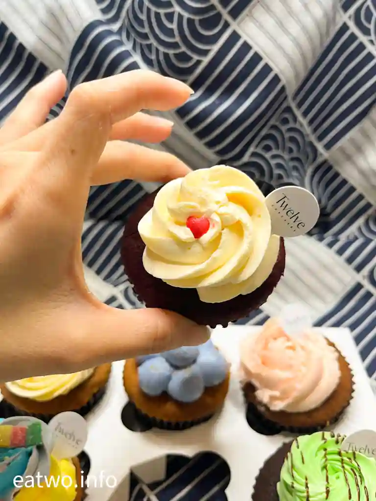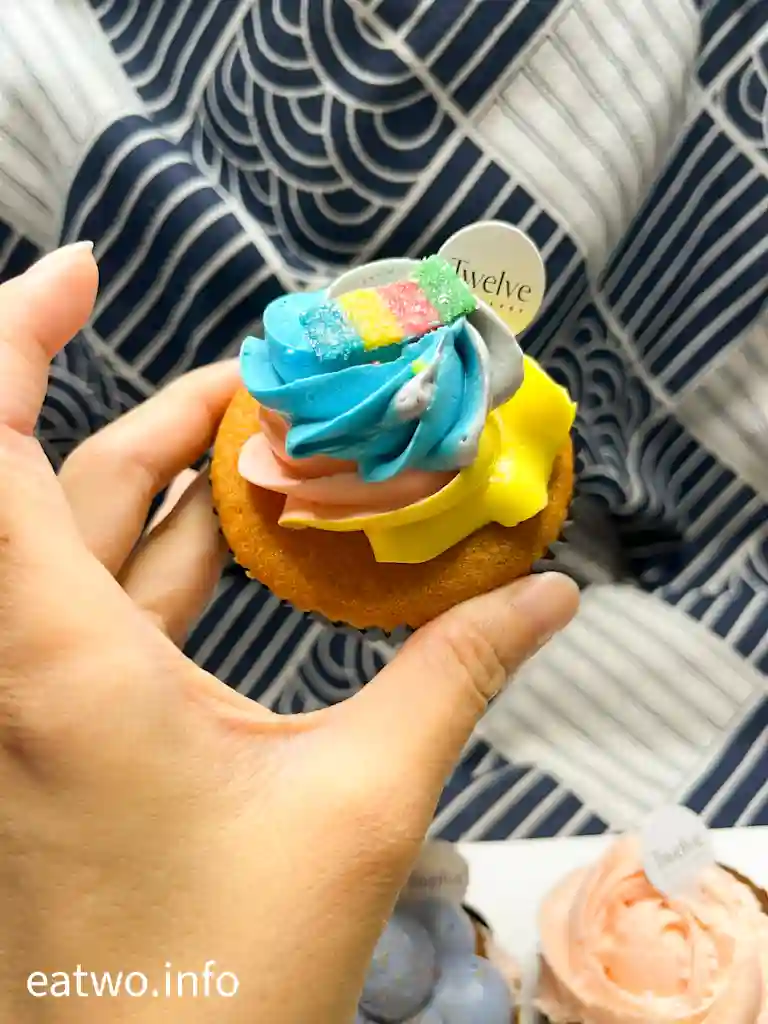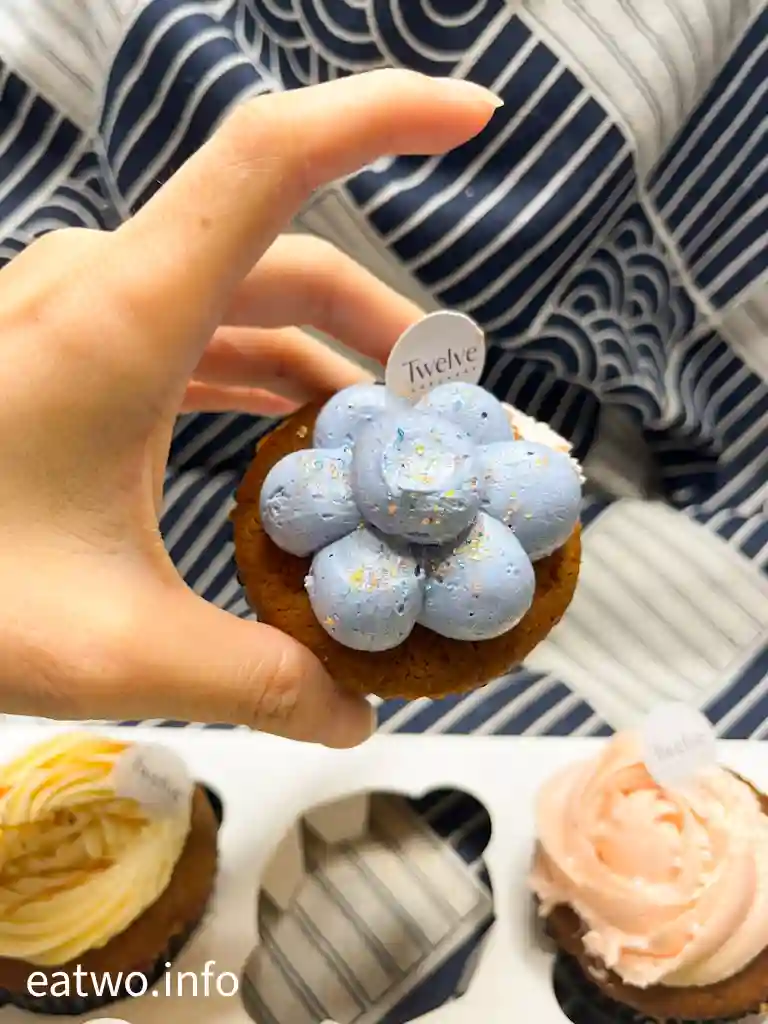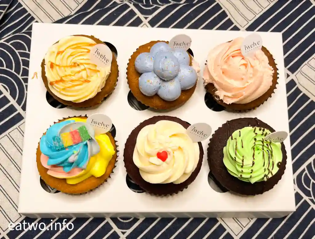 今次E.A.Two選擇「Twelve Cupcakes」嘅Regular size杯子蛋糕,雖則Cupcake口味有12款選擇,但我哋只係買咗半打,即係當中嘅一半。藍色怪獸係藍莓牛油忌廉配藍莓蛋糕;蝶豆花蜂蜜係蝶豆花牛油忌廉配蜂蜜蛋糕;甜蜜小熊係好立克牛油忌廉配好立克蛋糕;Nutella榛子醬朱古力係Nutella醬牛油忌廉配朱古力蛋糕;荔枝烏龍係荔枝牛油忌廉配烏龍茶蛋糕;薄荷朱古力係薄荷牛油忌廉配朱古力蛋糕;微笑花花係雲呢嗱牛油忌廉配檸檬蛋糕;夢幻彩虹杯係雲呢嗱牛油忌廉配雲呢嗱蛋糕;紅絲絨係紅心糖配忌廉芝士加紅絲絨蛋糕;岩鹽焦糖係岩鹽焦糖醬配雲呢嗱牛油忌廉加岩鹽雲呢嗱蛋糕;雙重朱古力係朱古力脆波配朱古力忌廉芝士加朱古力蛋糕;曲奇忌廉係曲奇配曲奇牛油忌廉加朱古力蛋糕。