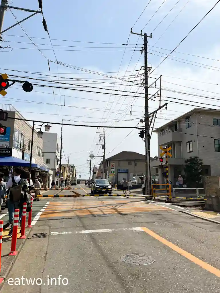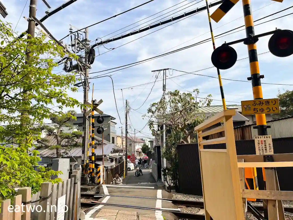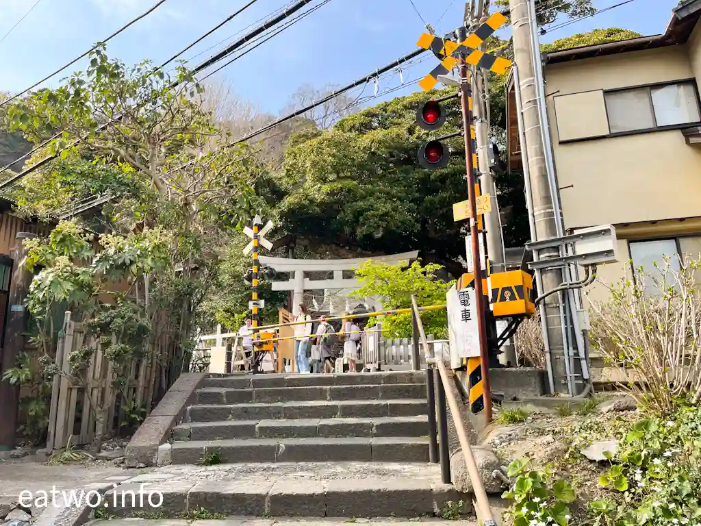 從另一邊走出「御靈神社」,會發現一隅會見到鐮倉江之電穿梭神社出入口跟前。呢個位置係江之電平交道旁邊,可以從獨特位置打卡古老神社鳥居同復古江之電火車駛過時嘅同框畫面呢!