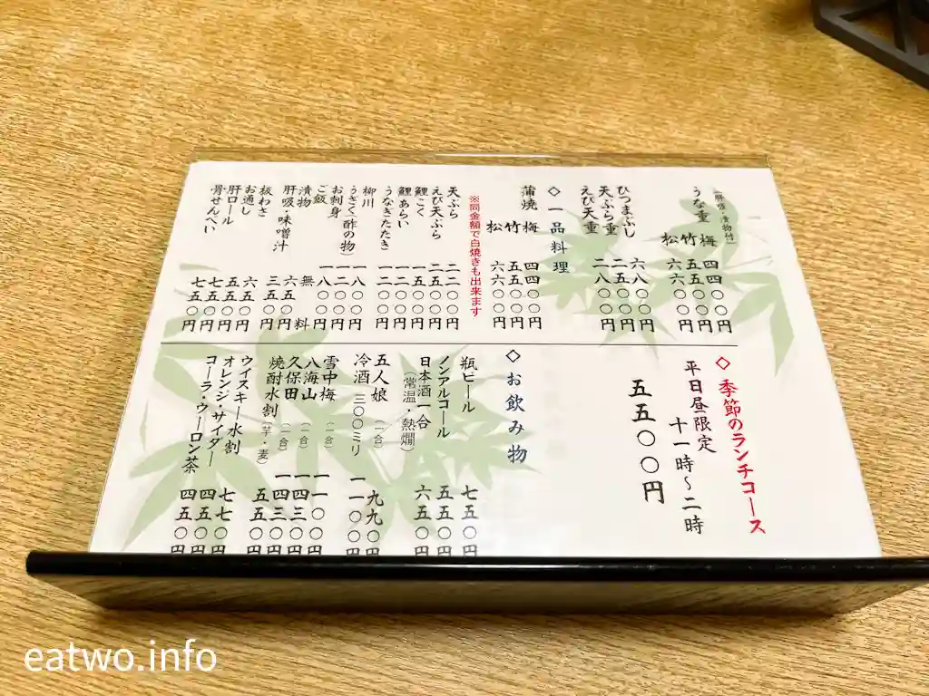 店內主要就係食鰻魚,價格上其實唔算平,單單鰻魚飯就分為梅、竹、松,每份分別為4400円、5500円、6600円,更有湯同前菜可以選擇。而一品料理同樣係分梅、竹、松,都係4400円、5500円、6600円,但一品料理都係蒲燒鰻魚嚟,但就無配搭白飯。換言之,有飯同無飯係同價,證明喺日本白飯係唔值錢。