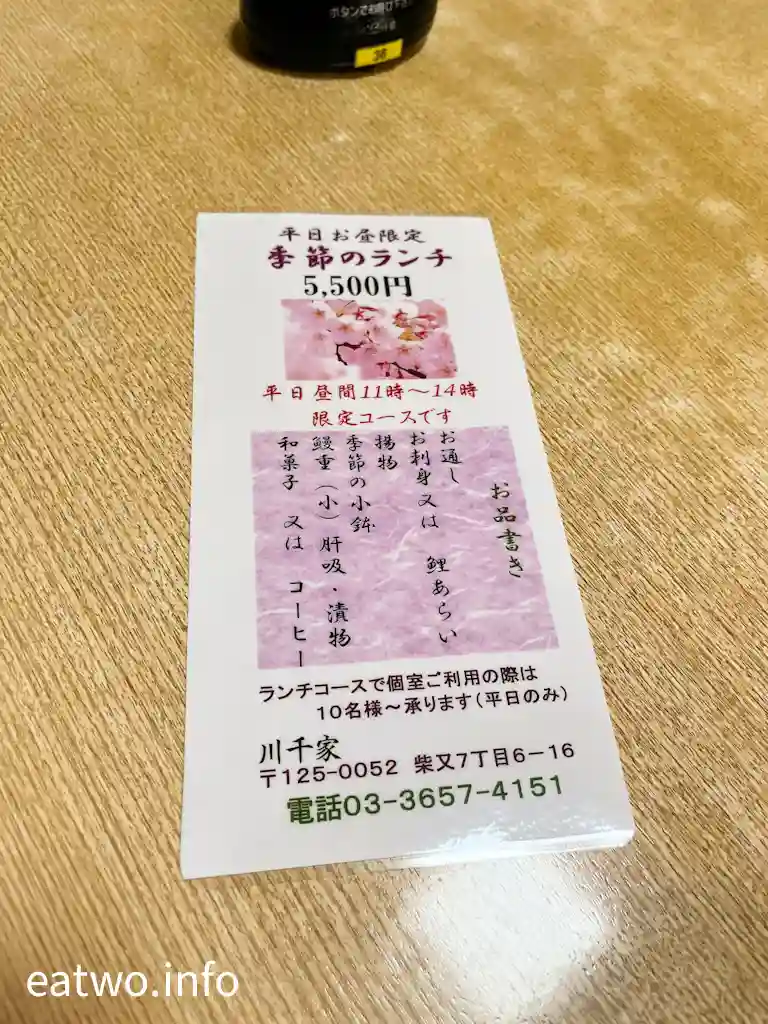 室內裝潢古樸味濃,但就似比較高級嘅餐廳感覺,一隅有正常雅座,另一邊就有榻榻米座位。另外,有時會有季節限定選擇,一份5500円,係套餐模式,當日似櫻花定食,但之後先見到,所以後悔無睇清楚旁邊餐牌就點餐。