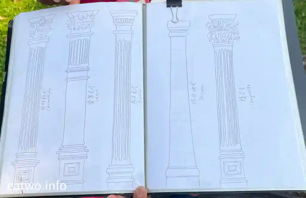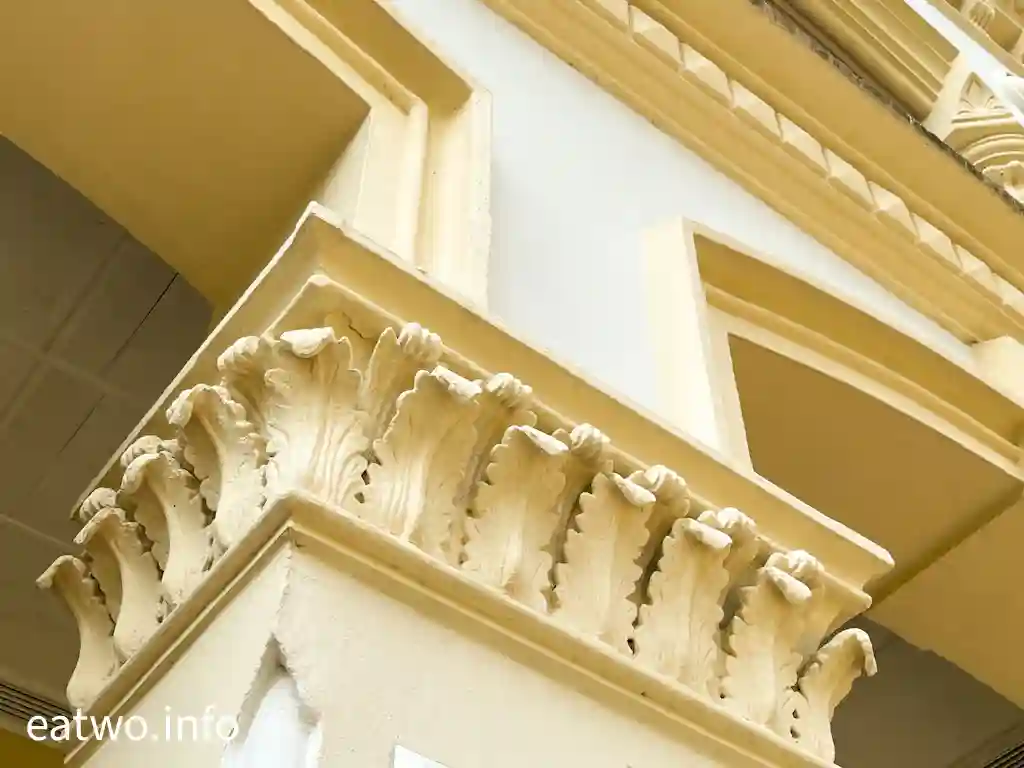 主樓建築物以淡黃色為主調,樓高兩層,位置海拔有約32米,頂端其實重有個屋頂,但企下面係難以見到。如果走到天台位置,視野係四面八方無遮擋,可以眺望港九新界嘅高山,連大嶼山都可以睇到﹐畢竟「天文台」建築物嘅作用就係觀測香港氣象。而最特別嘅就係建築物嘅風格,「天文台」大樓建築雕花特別吸睛,除咗地台係光滑雕花紋花崗石,天花線又有幾何圖案,原來係來自於科林斯式建築設計,條柱係長形削邊,見到角位係削過,柱頭、挑擔都係渦卷葉形設計,每一部份都係精雕細啄。