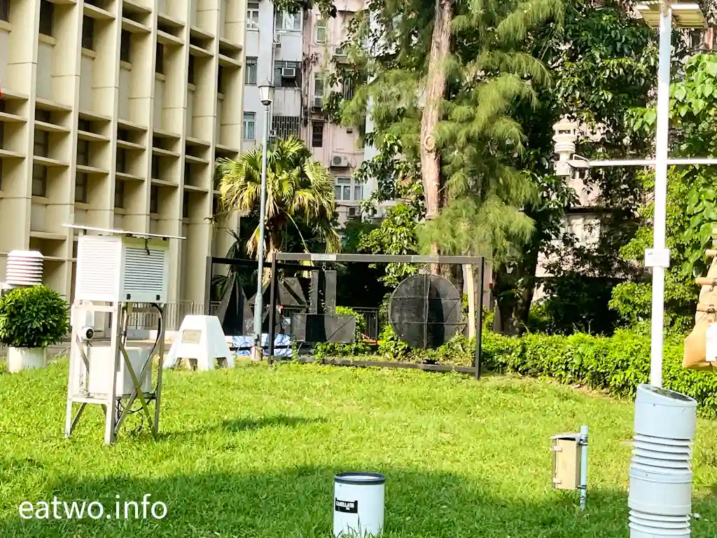 方形建築物外面草坪有唔少儀器,例如風速計、空氣溫度濕度計、地面和地底溫度計、雨量計、暑熱壓力計、微氣候監測站等儀器。走廊內更有一個地震監測室隱藏地下!不過,呢個位置就係嚴禁進入,導賞團義工更提醒要保持清靜。另外,一隅重有1號、3號、8號、9號風球,都係以前颳風來臨時掛喺鐵塔上嘅風球。事實上,以前重有2號風球同5號風球,只係後來取消咗。