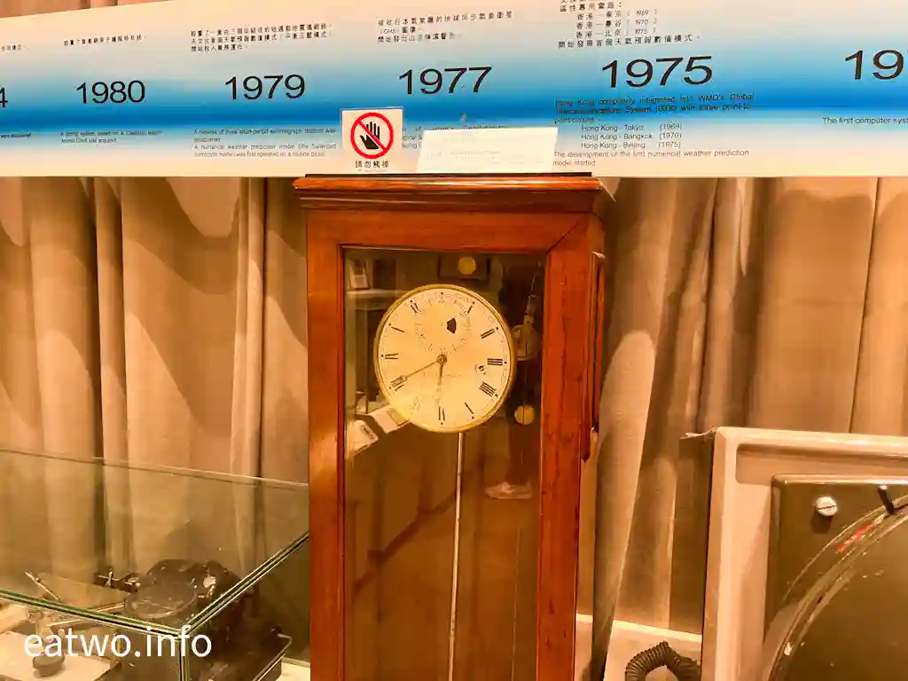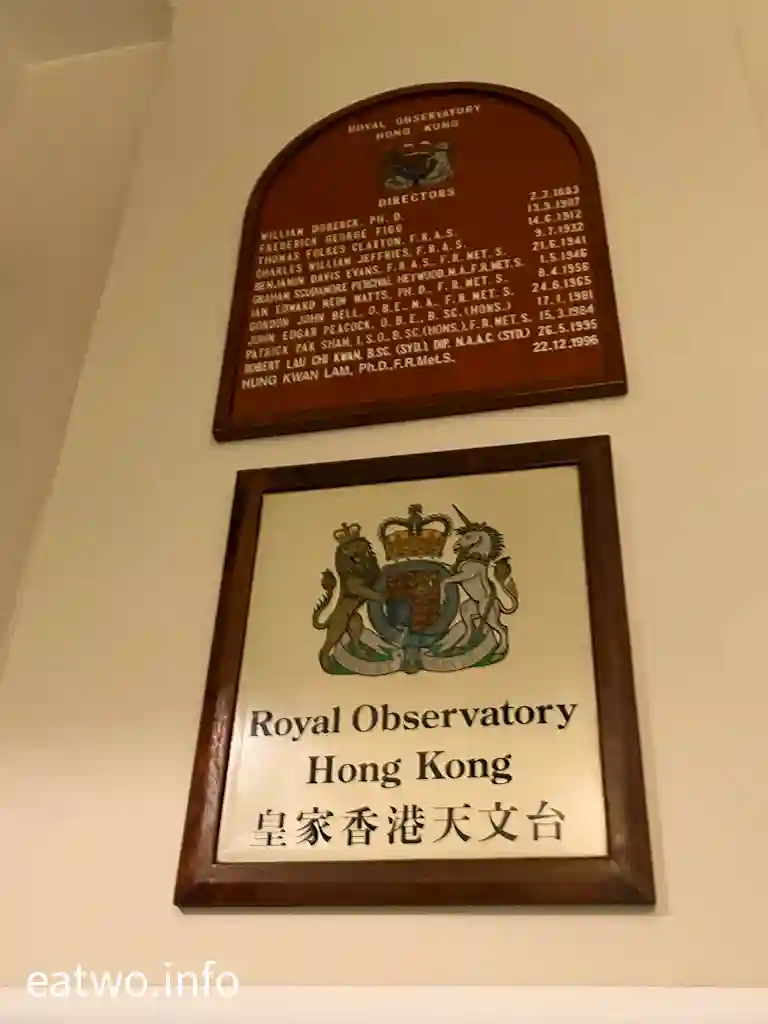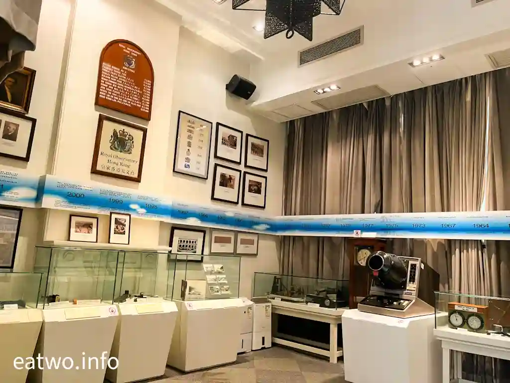 至於10號風球,目前就懸掛於歷史資料展覽室天花上。由60至70年代起,颱風來臨時已經唔再依賴「天文台」於鐵塔上懸掛嘅風球,只係由電台、電視台報道風球訊號,結果「天文台」更加被重重圍封兼難以進入窺視。成也科技,敗也科技。展覽室內有好多「天文台」舊時嘅展示品,包括以前用嘅時鐘,亦有其改過9次嘅台徽。另外,重點重有一個「皇家香港天文台(Royal Observatory Hong Kong)」嘅台徽牌,今時今日見到「皇家」真係特別感動。