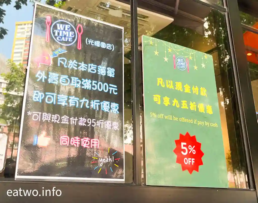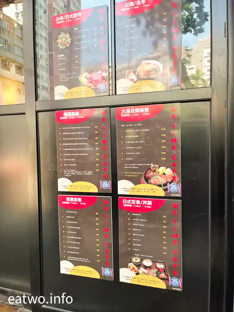 位於葵涌光輝圍內嘅「We Time Cafe」,表面睇似又係一間咖啡店,但實際上原來係一間西餐廳!該店週邊都係住宅,另一邊就係工業區,主打嘅就係街附近坊客。如果齋睇餐牌選擇,老實講伏味頗濃,因為餐牌乜都有!但細心啲睇,從餐牌選擇可以得知,有部份菜式係為咗遷就街坊客而定,有早餐又有特價下午茶,就算主打西餐,都有鳥冬、拉麵、沙律等選擇,等街坊唔使日日食西餐。