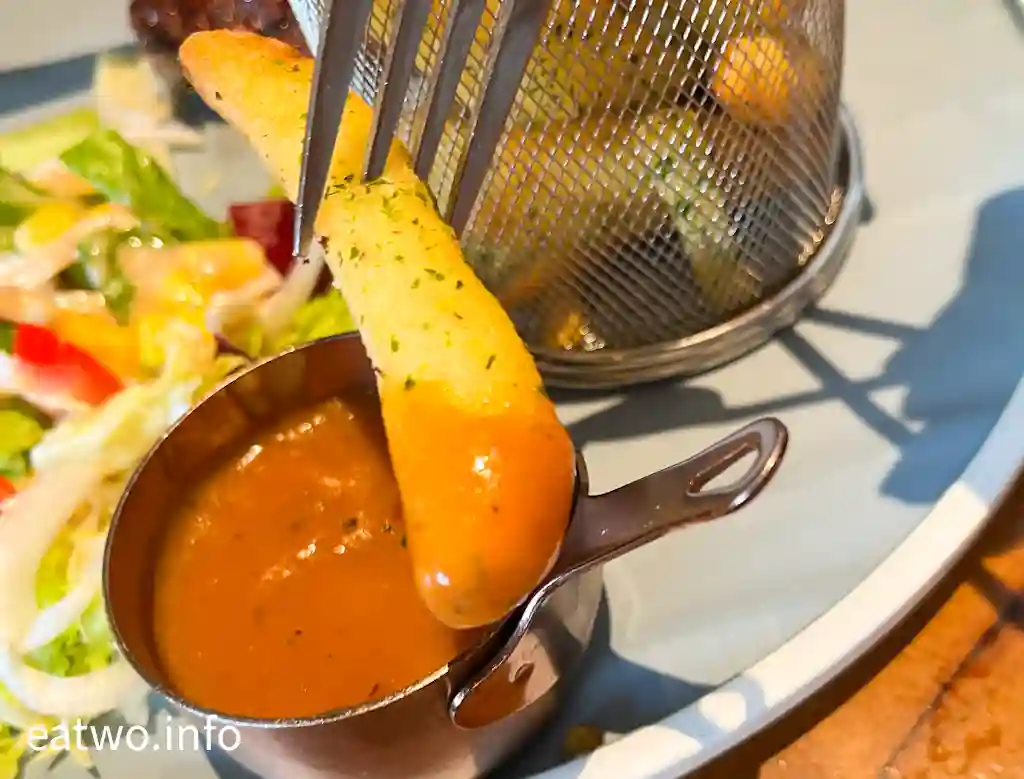 店內其實有款大滿足鐵板餐,今次就先試精選套餐,同樣係扒類,感覺似港式西餐風格。鐵板餐由$118起,包含餐湯、蒜蓉包,選擇固然係比較吸引,有西式牛扒、紐西蘭牛柳、安格斯牛肩扒、T骨牛扒、羊架、雞扒,可配蒜蓉汁、黑椒汁、牛仔燒汁,可以隨意跟飯、意粉或薯條。分別在於鐵板餐上檯會有「炸炸炸」嘅聲音,熱度較高,比較似真係去西餐廳鋸扒,而精選套餐就無。