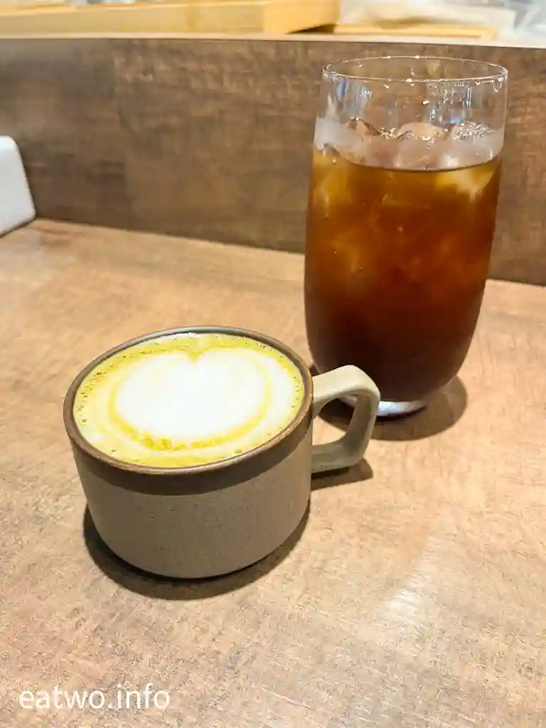 飲品有焙茶Latte $38、椰青冰咖啡$45,焙茶Latte上面有奶泡同微微拉花,茶粉沉澱之後味道會更濃郁,飲用之前輕輕攬拌會更好。而椰青冰咖啡就係椰青汁配咖啡,所以咖啡入口混有清甜味。
