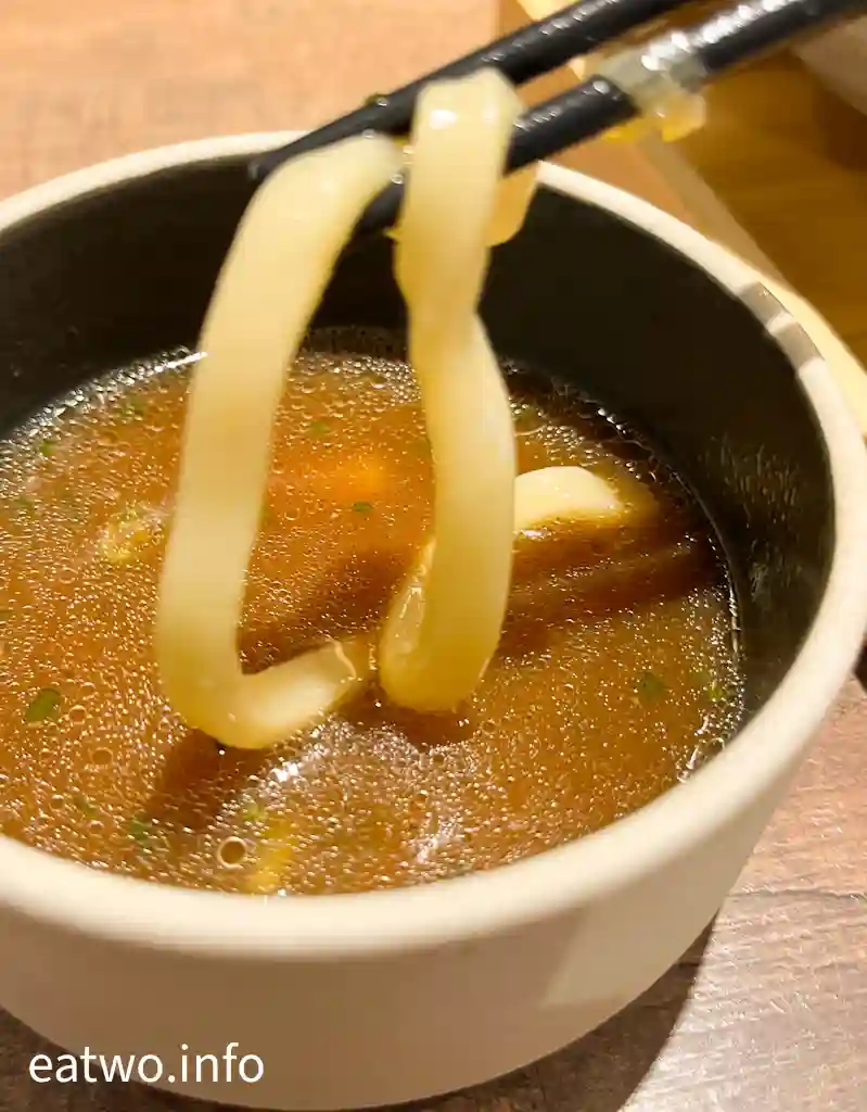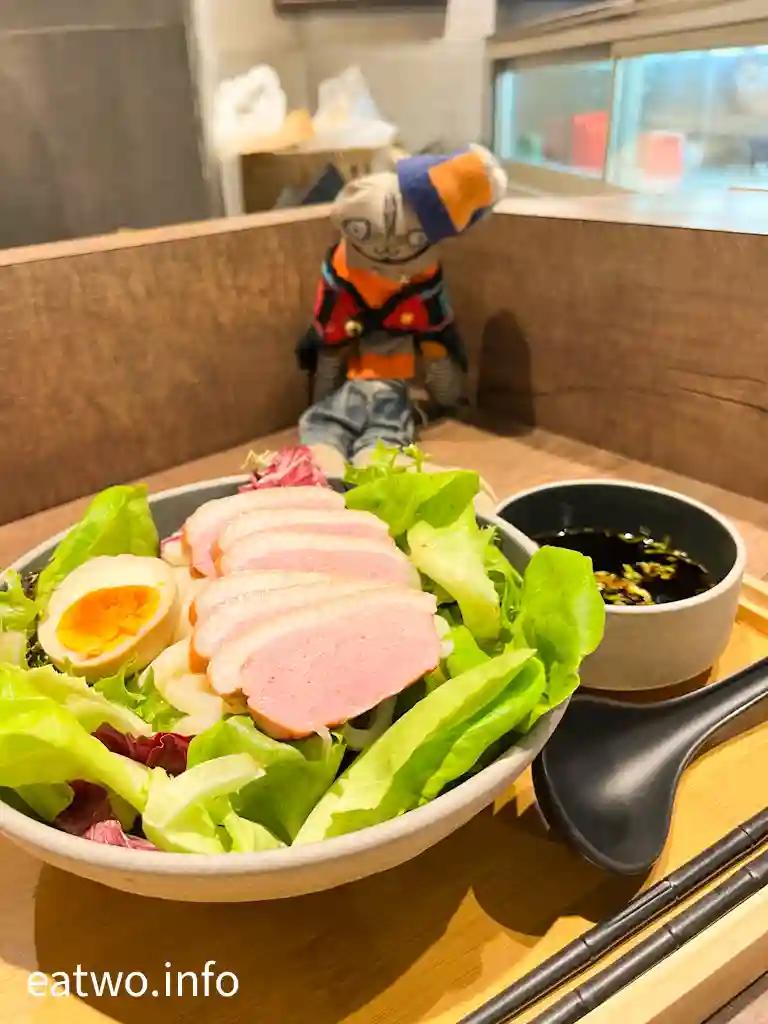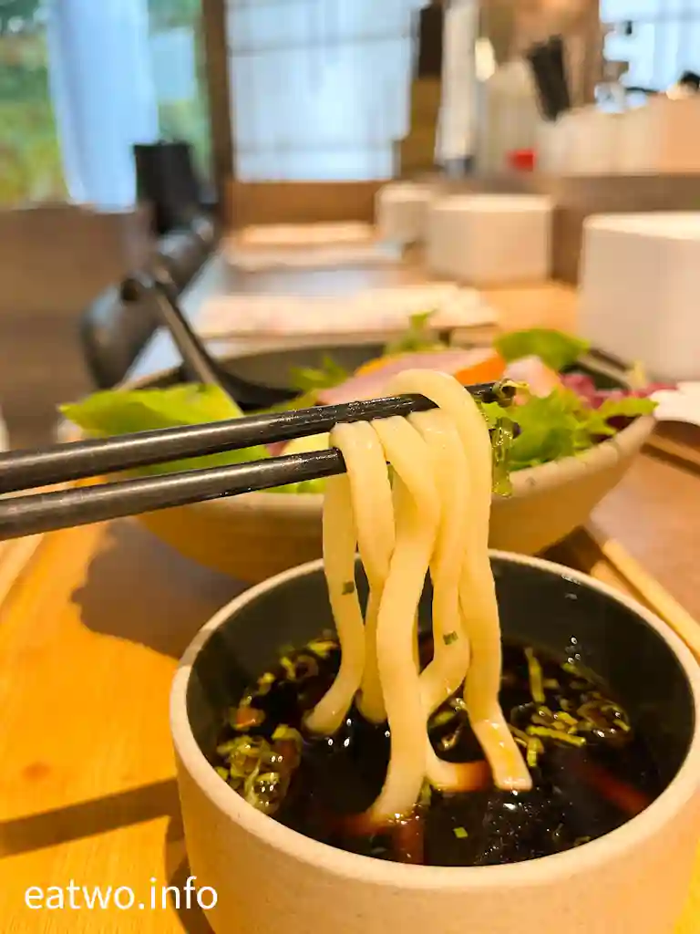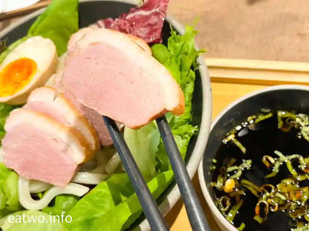 熱湯烏冬有8款,蠻字係期間限定$78,係慢煮熬製鴨湯烏冬配慢煮鴨胸,有讚岐手打烏冬、九條蔥、糖心日本蛋、新鮮蔬菜、慢煮熬製鴨湯。而冷烏冬就有4款,澄字$58,冷烏冬配日和慢煮鴨胸,同樣有讚岐手打烏冬、九條蔥、水耕菜、糖心日本蛋、慢煮熬製溜醬油鰹魚湯。沙律就有3款,基本上熱湯、冷拌、沙律配搭嘅配料都係差唔多。冷食嘅烏冬質感係比較爽滑彈牙,醬汁就比較正常發揮;熱湯嘅烏冬比較軟身,但都係堅韌,係相對有比較濃嘅湯汁,味道上會較吸引﹐湯汁入面有九條蔥。而同樣係鴨胸,熱湯選擇嘅就係慢煮風格。
