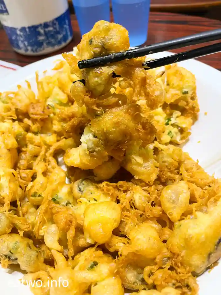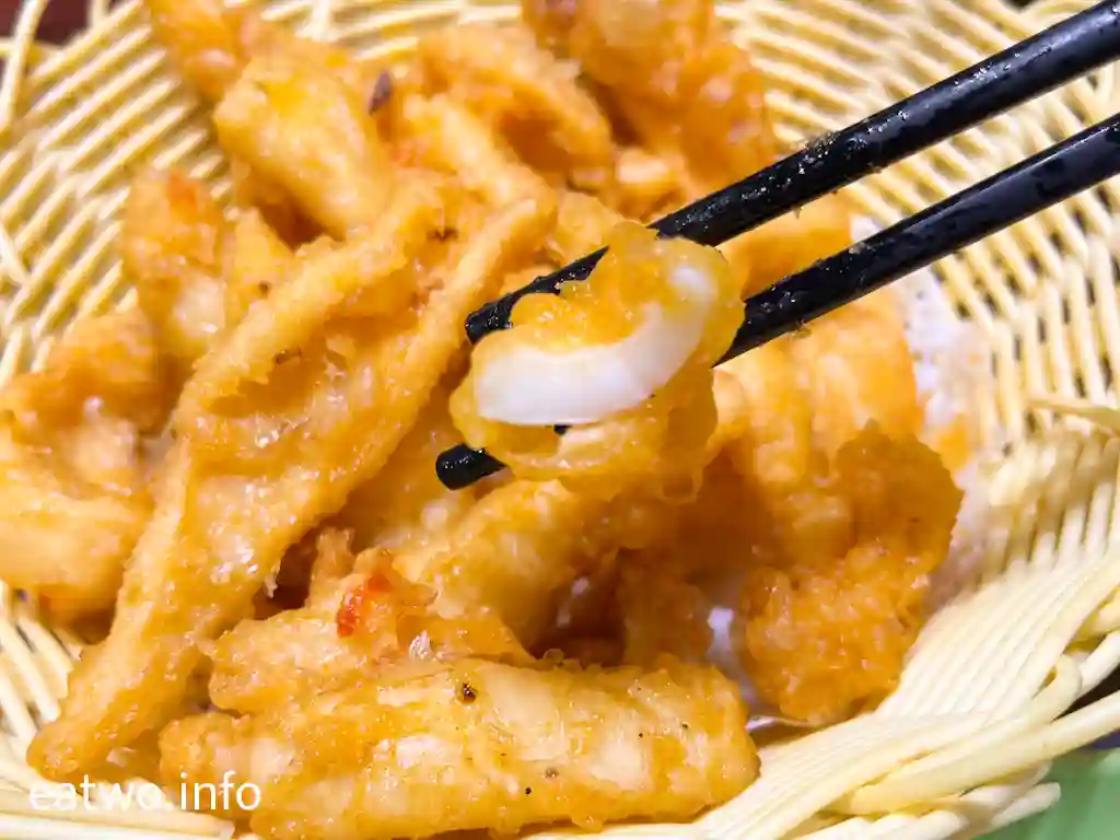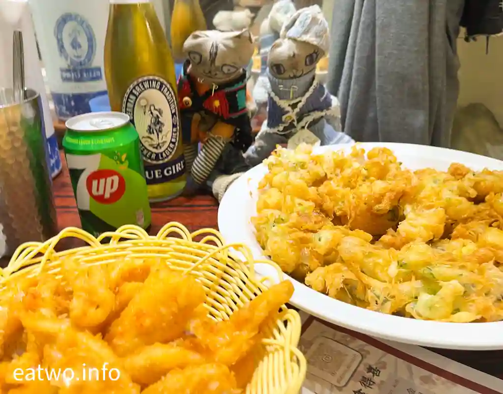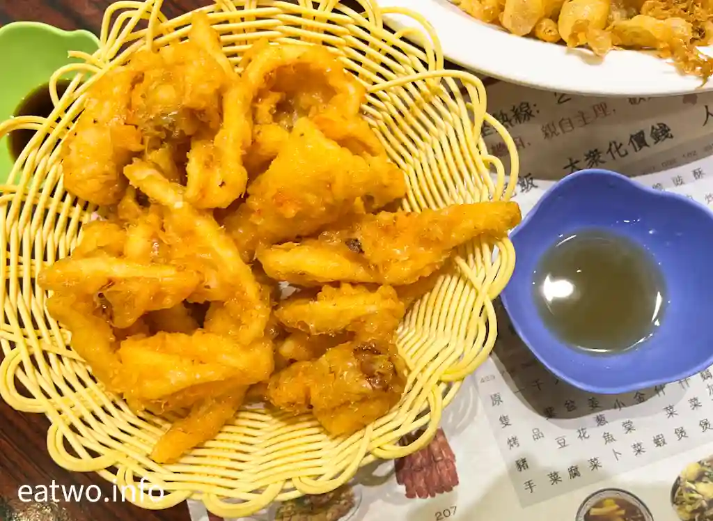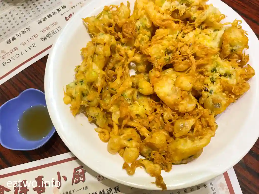 本來想食潮州蠔餅,但原來店內嘅蠔餅係一款獨特嘅酥炸蠔餅。大大碟蠔餅用脆炸方式炮製,顯得上檯更有氣勢。不過係有啲失望,蠔仔量唔算好多,最多算正常,可以接受。但脆皮份量佔多﹐將麵粉同蠔仔炸物一齊,麵粉將油吸晒,所以特別油膩,好快已經食到好滯,類似魚露嘅醬汁好似都無乜大作用。反而,椒鹽鮮魷真係非常驚喜,金黃色薄薄脆皮只係黏住魷魚,而魷魚量亦多,件件都有一定厚度,椒鹽唔會好鹹,味道適中,加上微酸醬汁更加可以解膩。