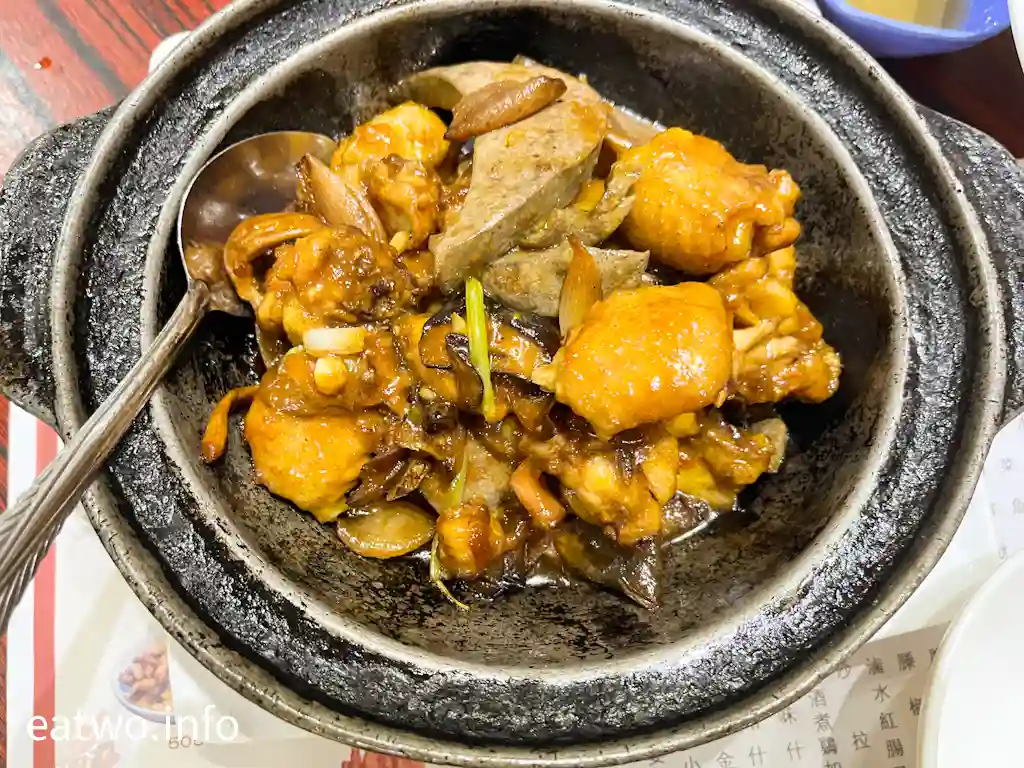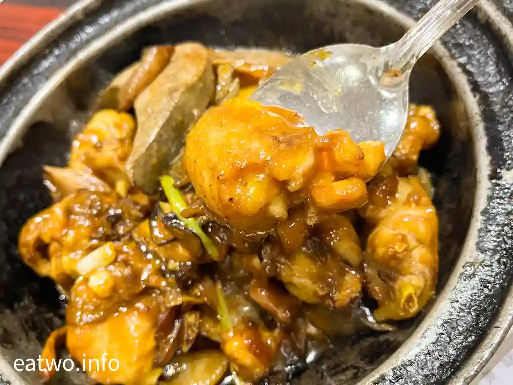 去大排檔係會想食平常難以食到嘅菜式,例如有個煲字嘅乜煲物煲。今次就選擇咗啫啫雞煲,上檯時就有啫啫聲,但好快就消失晒,好似唔夠熱。雞肉量唔算好多,唔知點解我哋嗰煲特別多雞轉彎,即雞翼轉角位,恍惚雞膶量比雞肉更多。不過,食得到雞肉真係嫩滑同入味嘅,而精華就去晒菇同乾蔥度。至於豉汁蒸大鱔就比較平凡,屬於標準水平,份量同味道同「濃姐茶餐廳」碟頭飯相近。