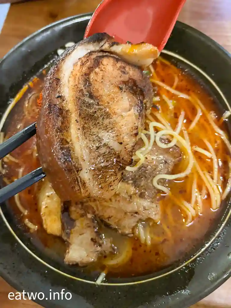 而拉麵可以直接配搭小食同飲品,選擇套餐,今次就要一款辛辣拉麵套餐$115。呢碗入面嘅叉燒係火炙叉燒,而且係厚切叉燒,肥瘦適中,有焦香,厚切竟然比薄切叉燒軟腍。整體唔算有咩驚喜,只係湯底話辛辣味就係辛辣味,入面有紅椒、肉碎、黑木耳同蔥花,無咩多餘配搭,係夠辛辣感。