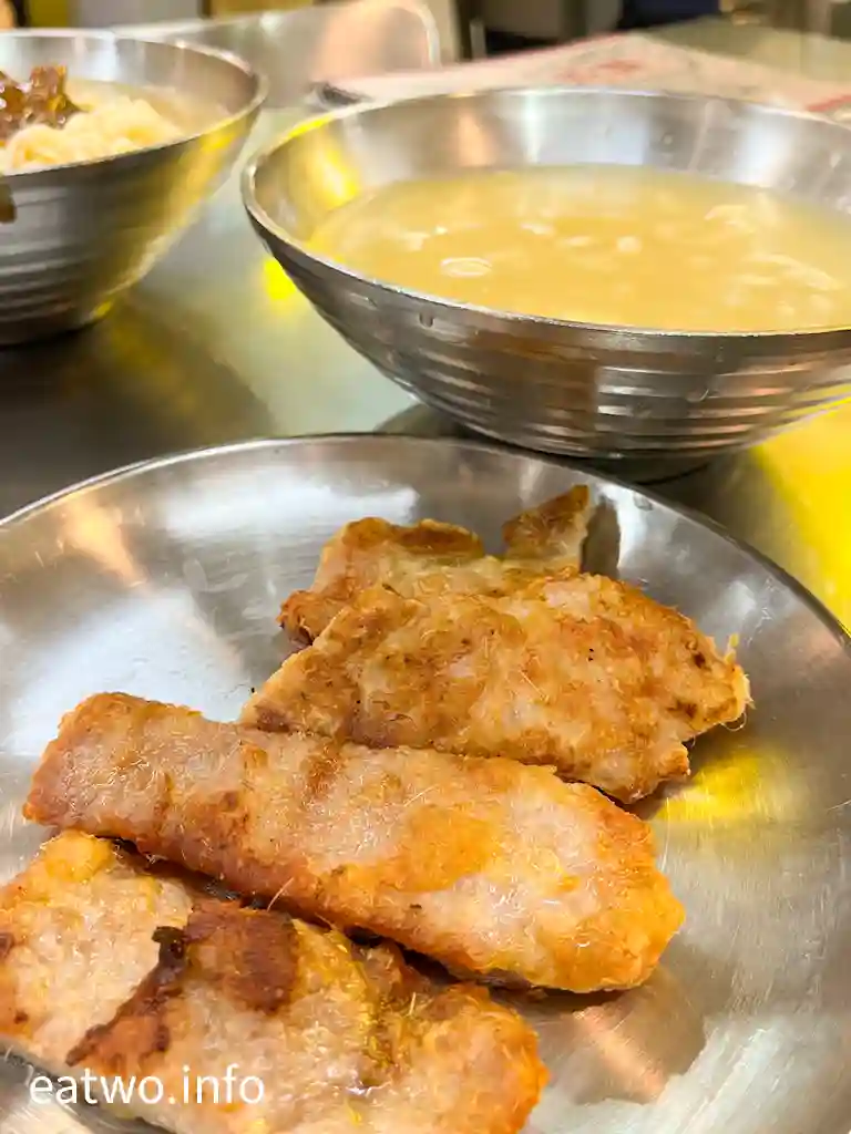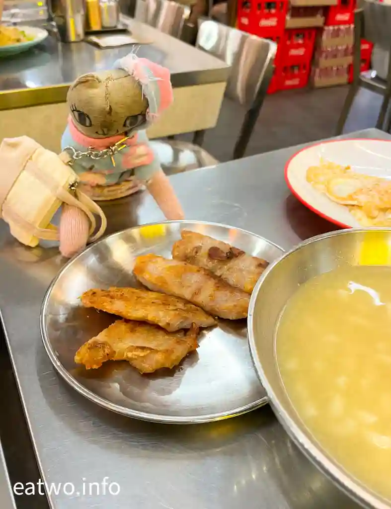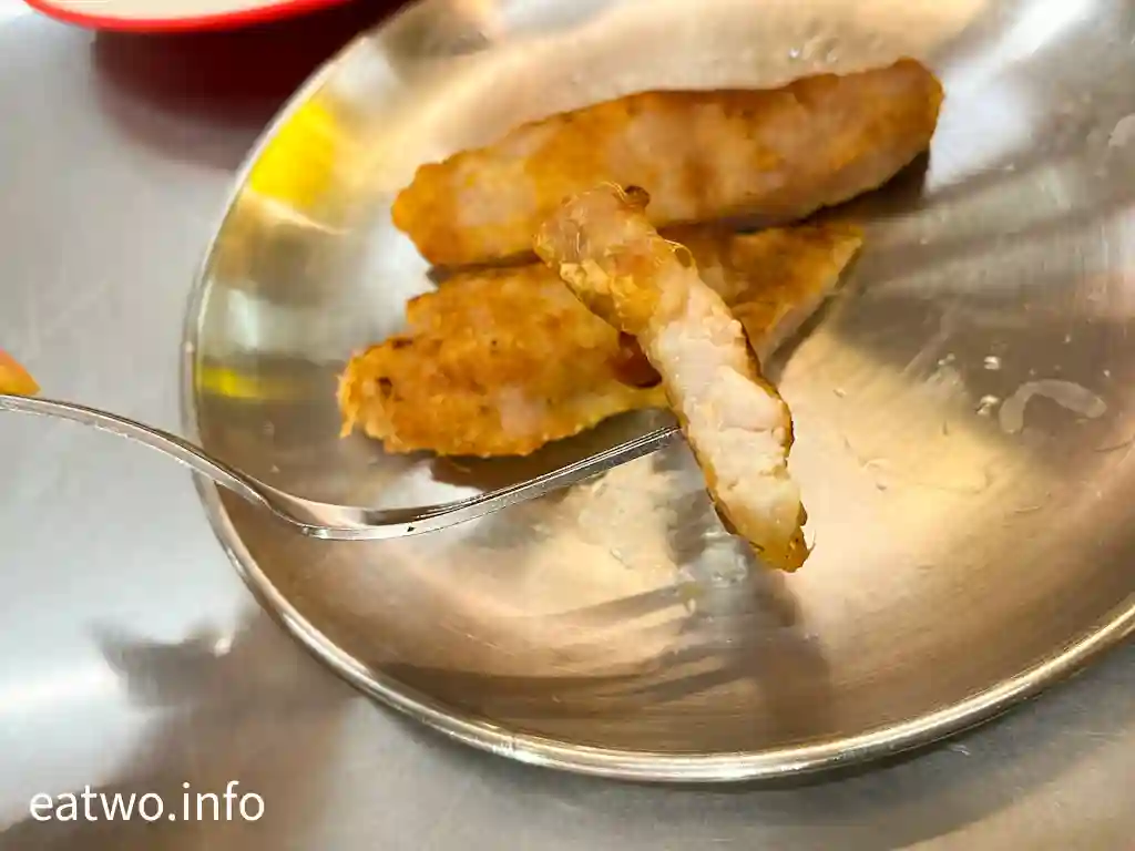 另一款係豬扒通粉,店內好識做地將炸豬扒同湯粉分開上檯,所以炸物唔會被浸軟。而通粉底好似多咗胡椒粉,加返沙嗲汁溝返會好好多。炸豬扒係炸得好乾身,表皮真係脆,係硬咗啲,不過入面就係幾軟腍。