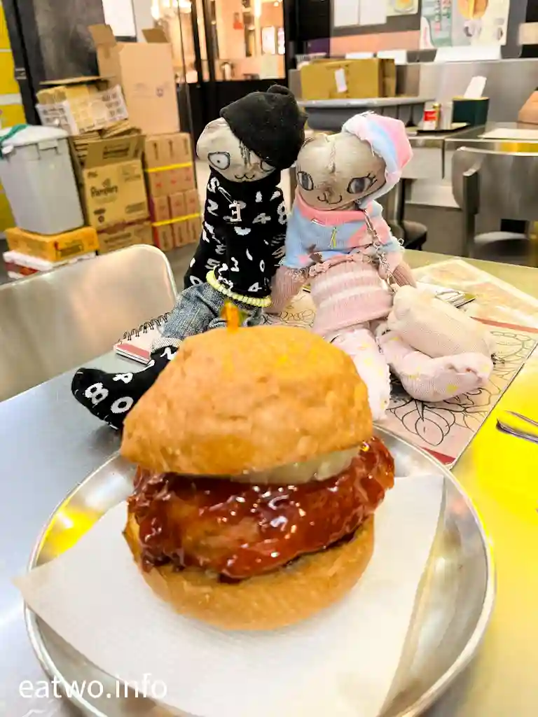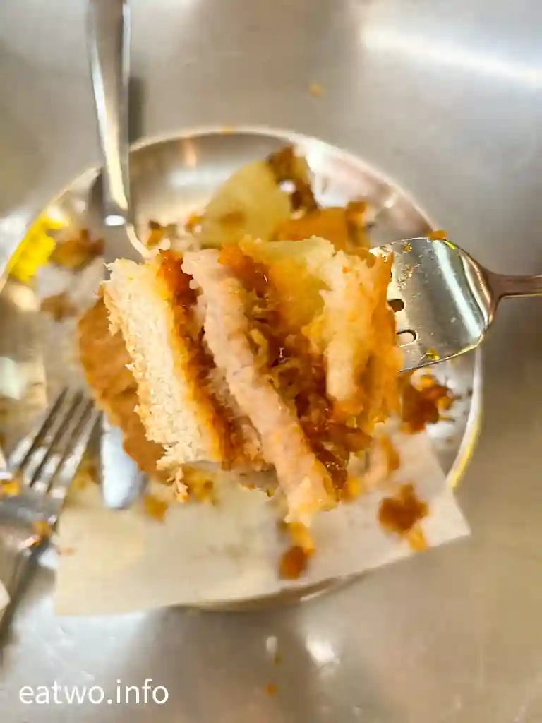飲品除咗咖啡或茶,亦可以加$9至$12配搭紅豆冰或紅豆奶茶,檸檬同紅茶基底都係唔差,奶茶都算濃同順口,紅豆量都幾多,紅豆好軟腍同香甜。小食有炸雞髀、西多士,沙嗲牛肉包、豬扒包等﹐E.A.Two覺得最特別係咕嚕拔絲豬扒包$39。